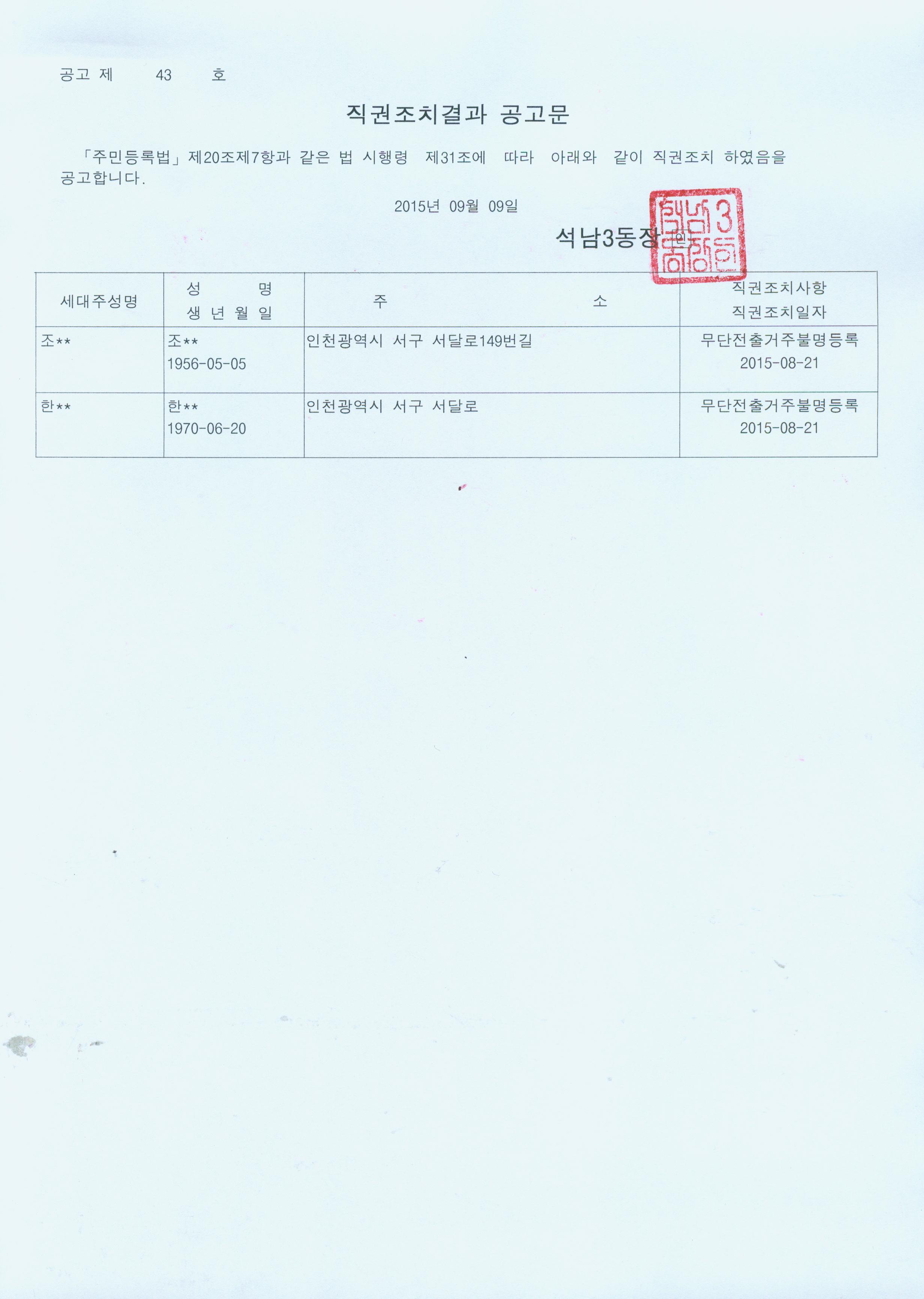 주민등록 무단전출자에 대하여 주민등록법 제20조제7항 및 동법시행령 제31조 규정에 의거 아래와 같이 직권조치 하였음을 공고합니다.
