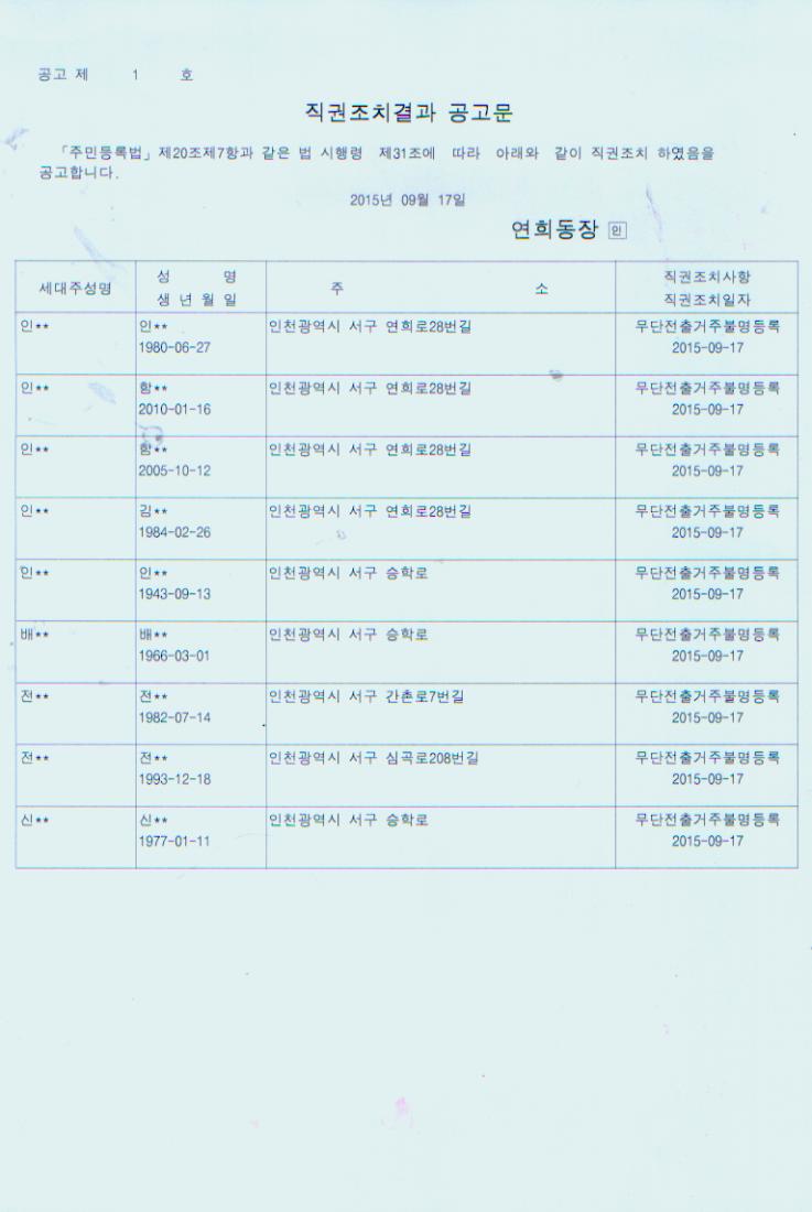 주민등록 무단전출자에 대하여 주민등록법 제20조 제7항 및 동법 시행령 제31조 규정에 의거 아래와 같이 직권조치 하였음을 공고합니다.