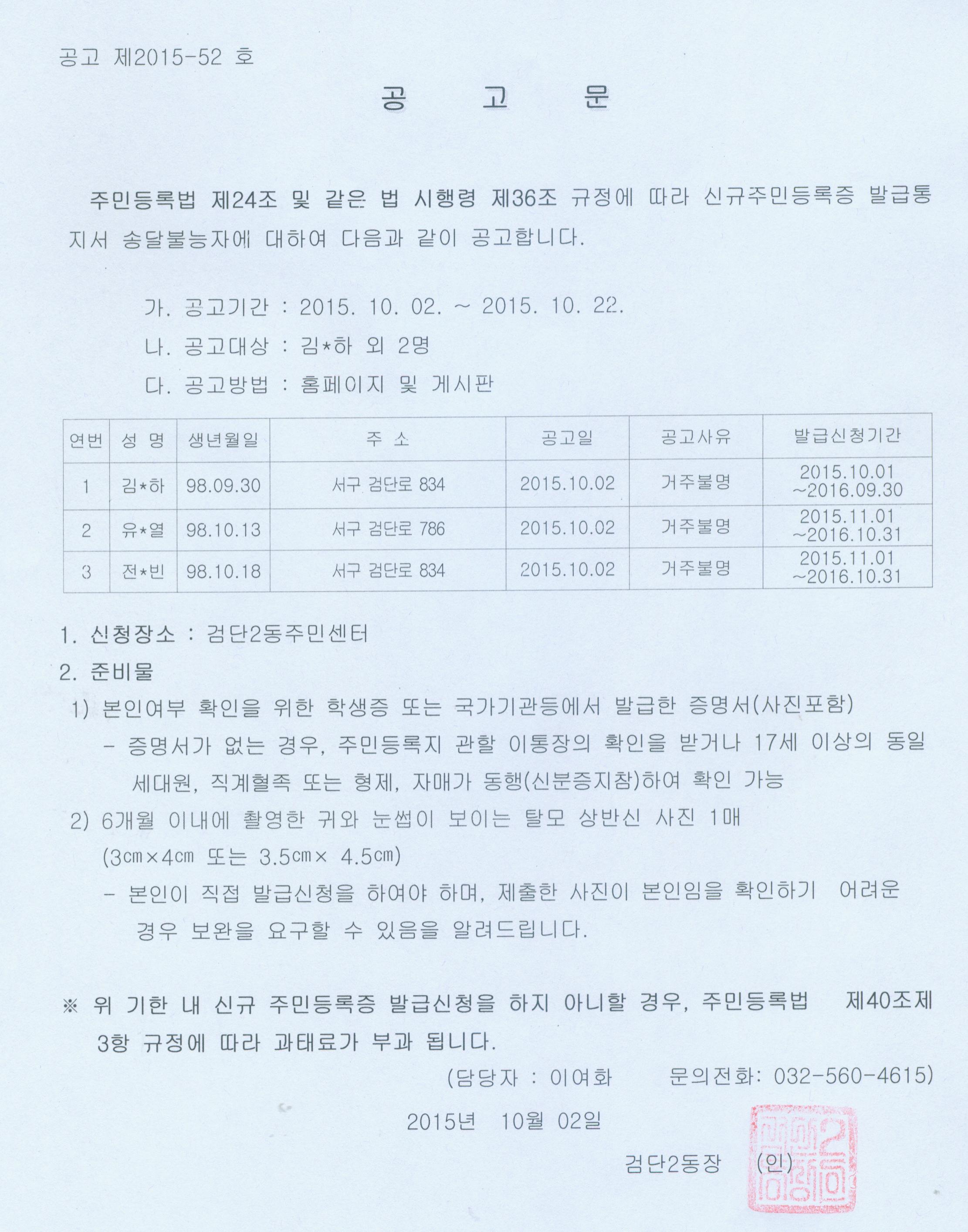 주민등록법 제24조 및 같은 법 시행령 제36조 규정에 따라 신규주민등록증 발급통지서 송달 불능자에 대하여 다음과 같이 공고합니다.