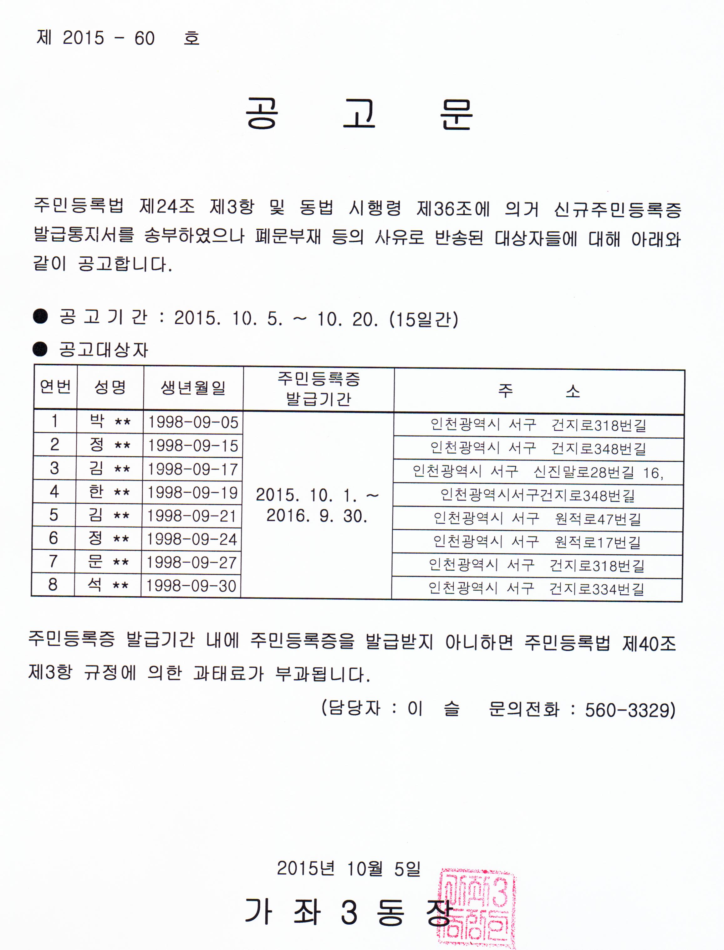 주민등록법 제24조 제3항 및 동법 시행령 제36조에 의거 신규주민등록증 발급통지서를 송부하였으나 폐문부재등의 사유로 반송된 대상자들에 대해 아래와 같이 공고합니다.