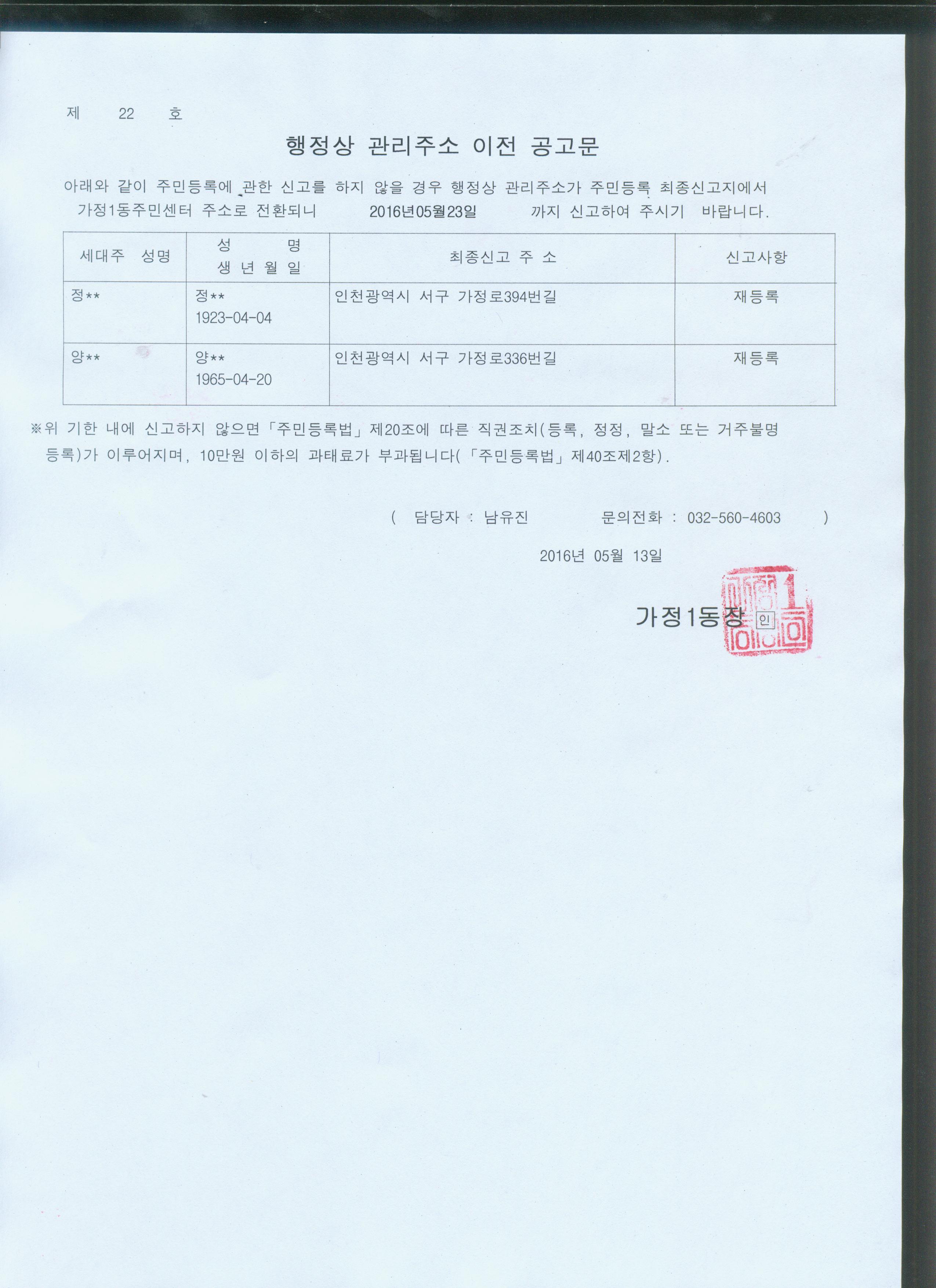 주민등록법 제 20조 제6항 및 주민등록법 부칙<제9574호, 2009.04.01> 제2조(종전 법률의 개정에 따른 거주불명등록에 관한 특례)에 따라 주민등록 거주불명등록자에 대하여 행정상 관리주소를 주민등록 최종신고지에서 가정1동 주민센터 주소로 전환하고자 [게시판 및 홈페이지]에 아래와 같이 행정상 관리주소 이전 공고(2차)하고자 합니다.