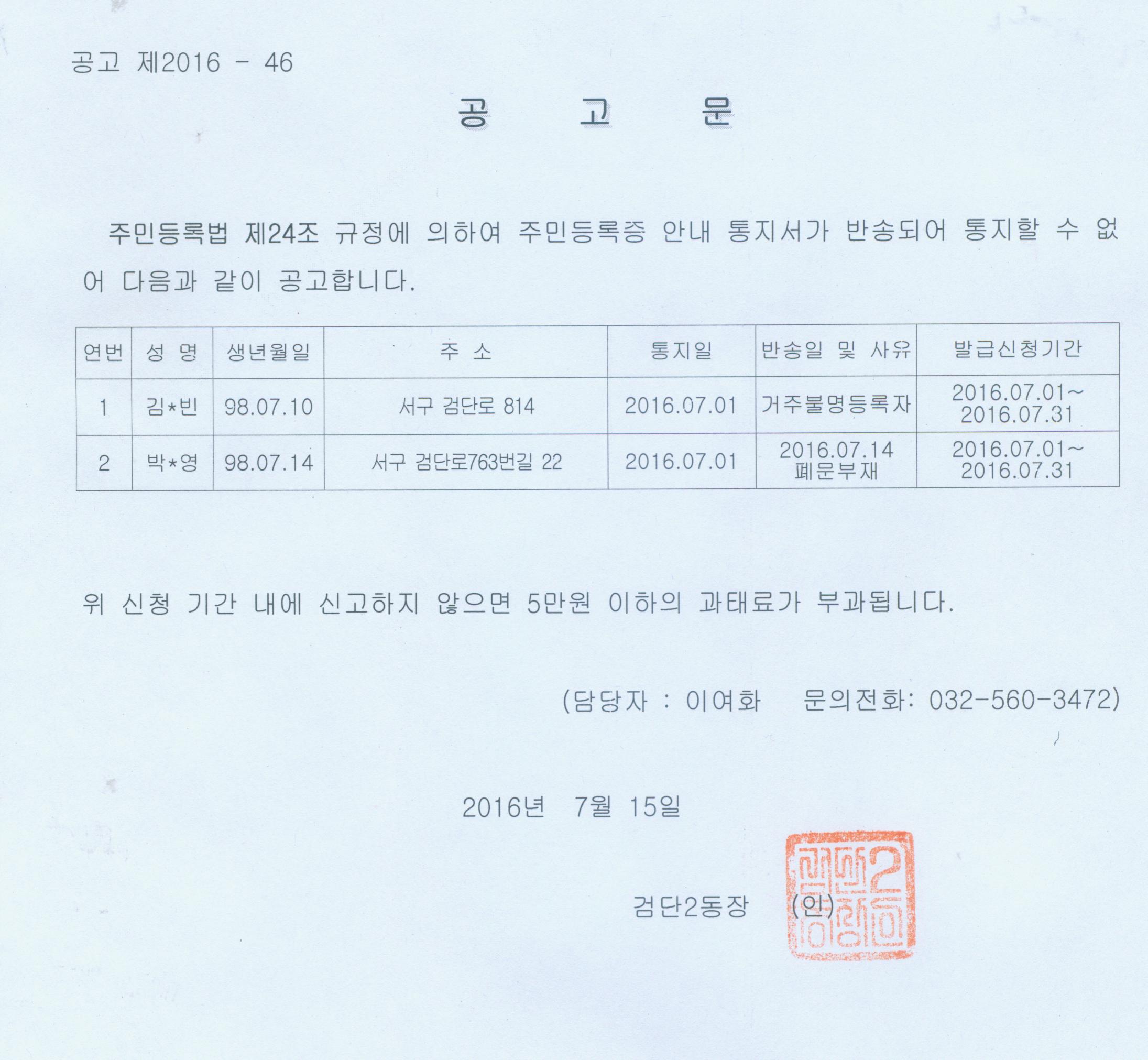 주민등록법제24조에 의거 주민등록증 신규 미발급자 안내 통지서를 등기를 통해 통지하였으나, 폐문부재 등의 이유로 반송되어 온 자에 대하여 아래와 같이 공고합니다.