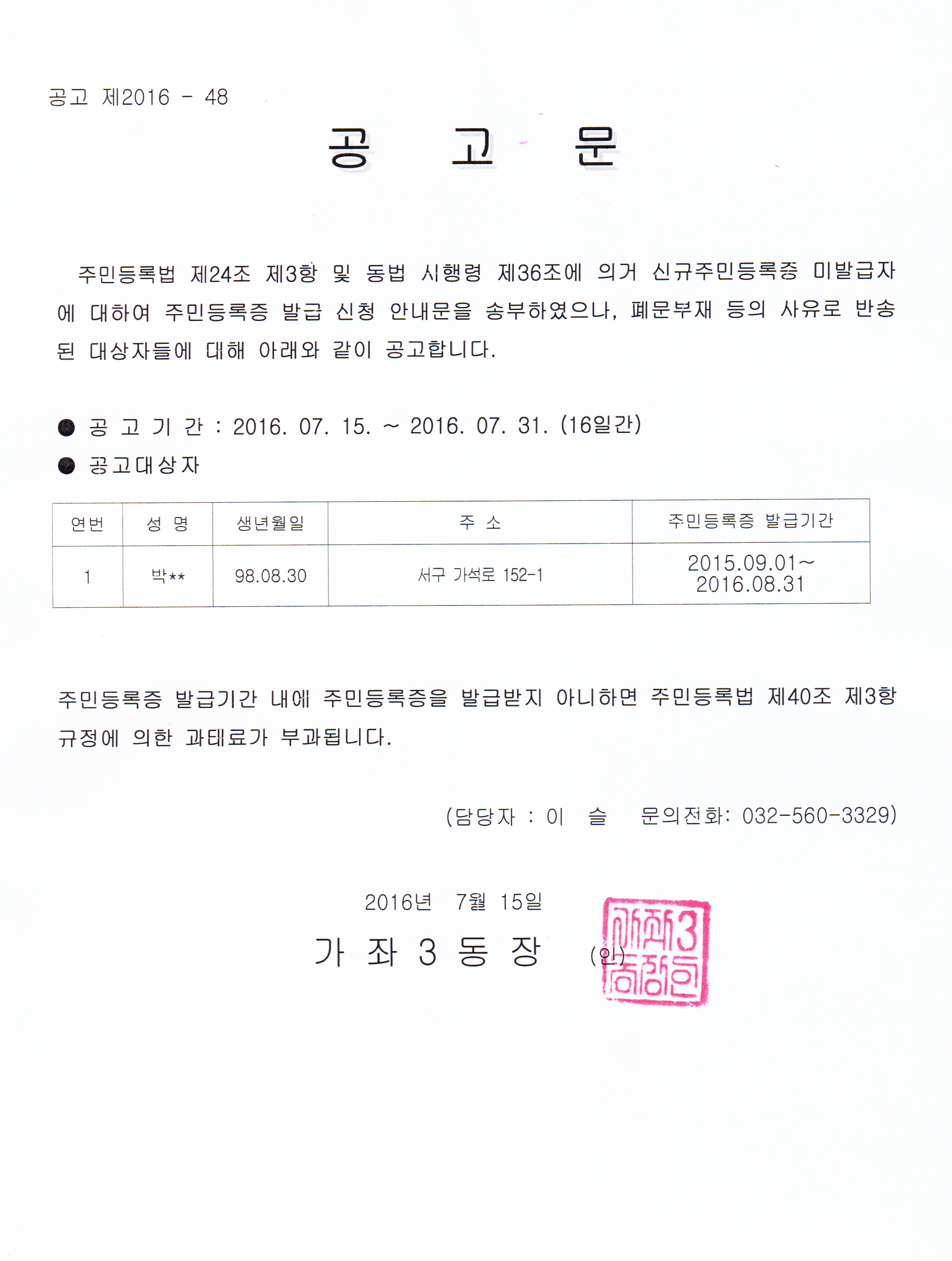 주민등록법 제24조제3항 및 같은 법 시행령 제36조에 의거 신규주민등록증 미발급자에 대하여 주민등록증 발급신청안내문을 송부하였으나, 폐문 부재의 사유로 반송된 대상자에 대해 아래와 같이 공고합니다.