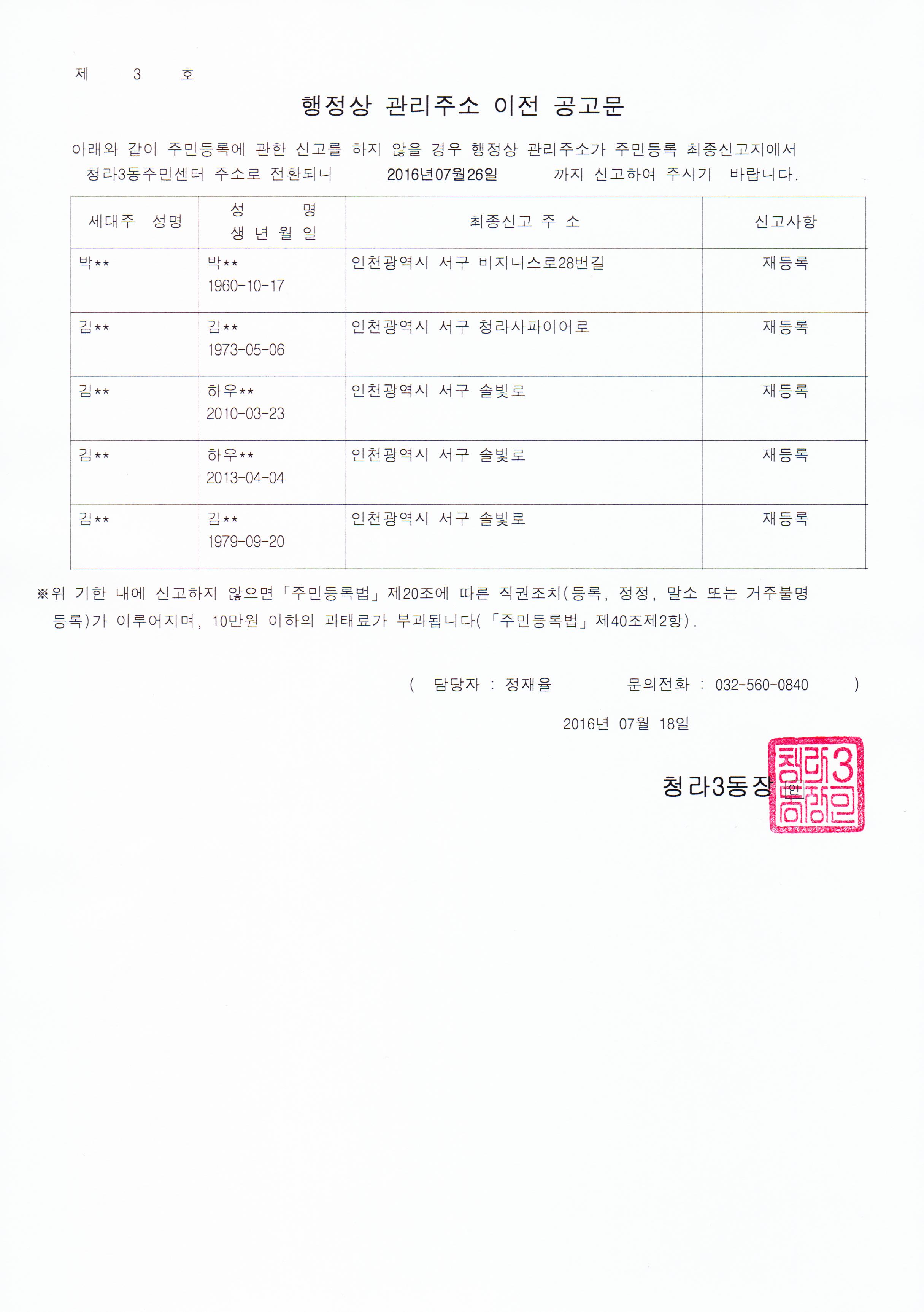 주민등록법 제20조 제6항 및 부칙 제2조에 의거, 거주불명등록 후 1년이 경과한 거주불명등록자에 대하여 아래와 같이 행정상 관리주소를 청라3동 주민센터로 이전 하기 위하여 2차 공고하고자 합니다.