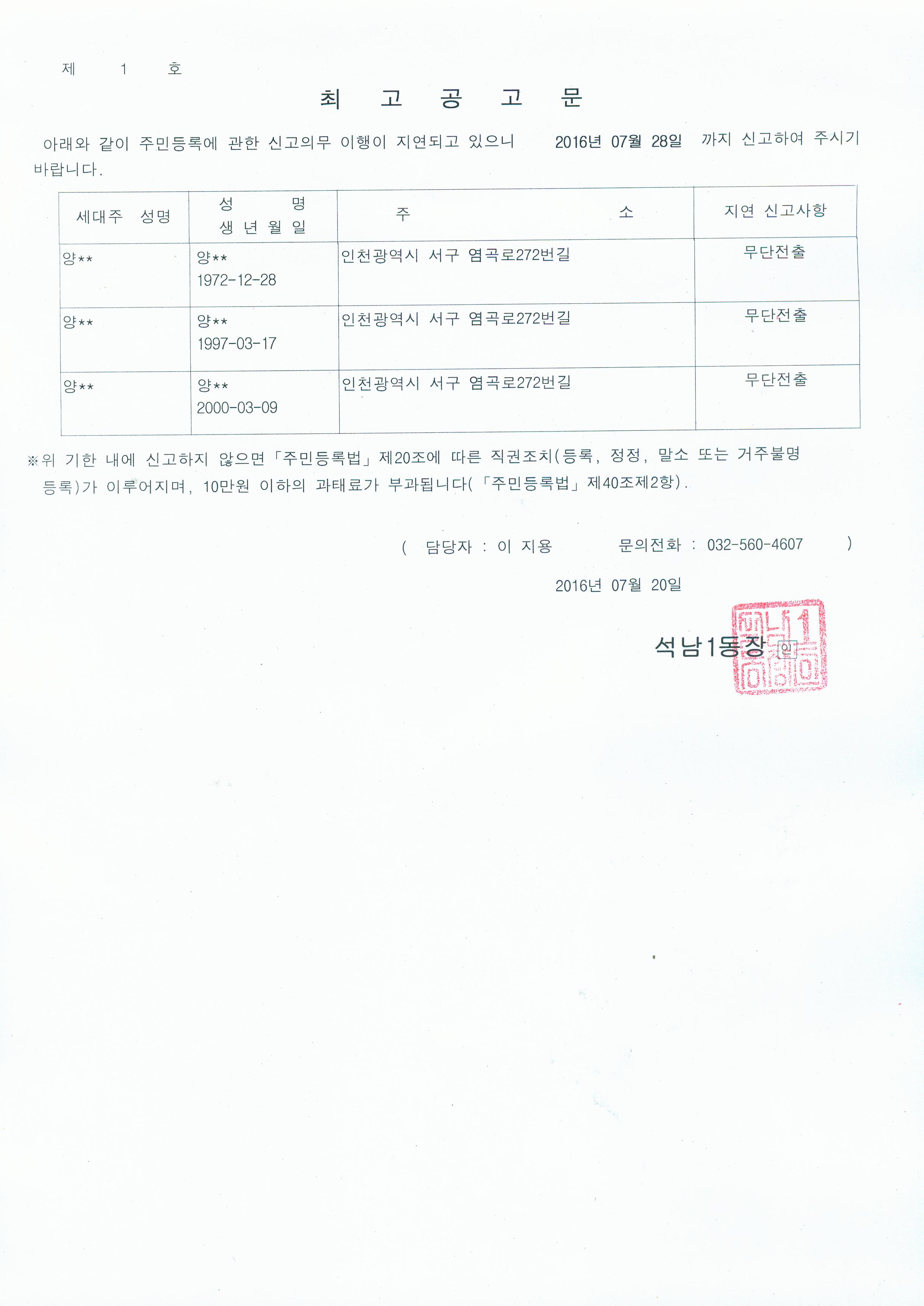 주민등록 무단전출자에 대해 주민등록법 제20조 및 같은 법 시행령 제28조의 규정에 의거 기간 내에 신고하도록 최고를 하였으나, 최고장의 반송으로 해당 무단전출자에 대한 최고공고문을 아래와 같이 [홈페이지] 및 [게시판]에 공고하고자합니다.