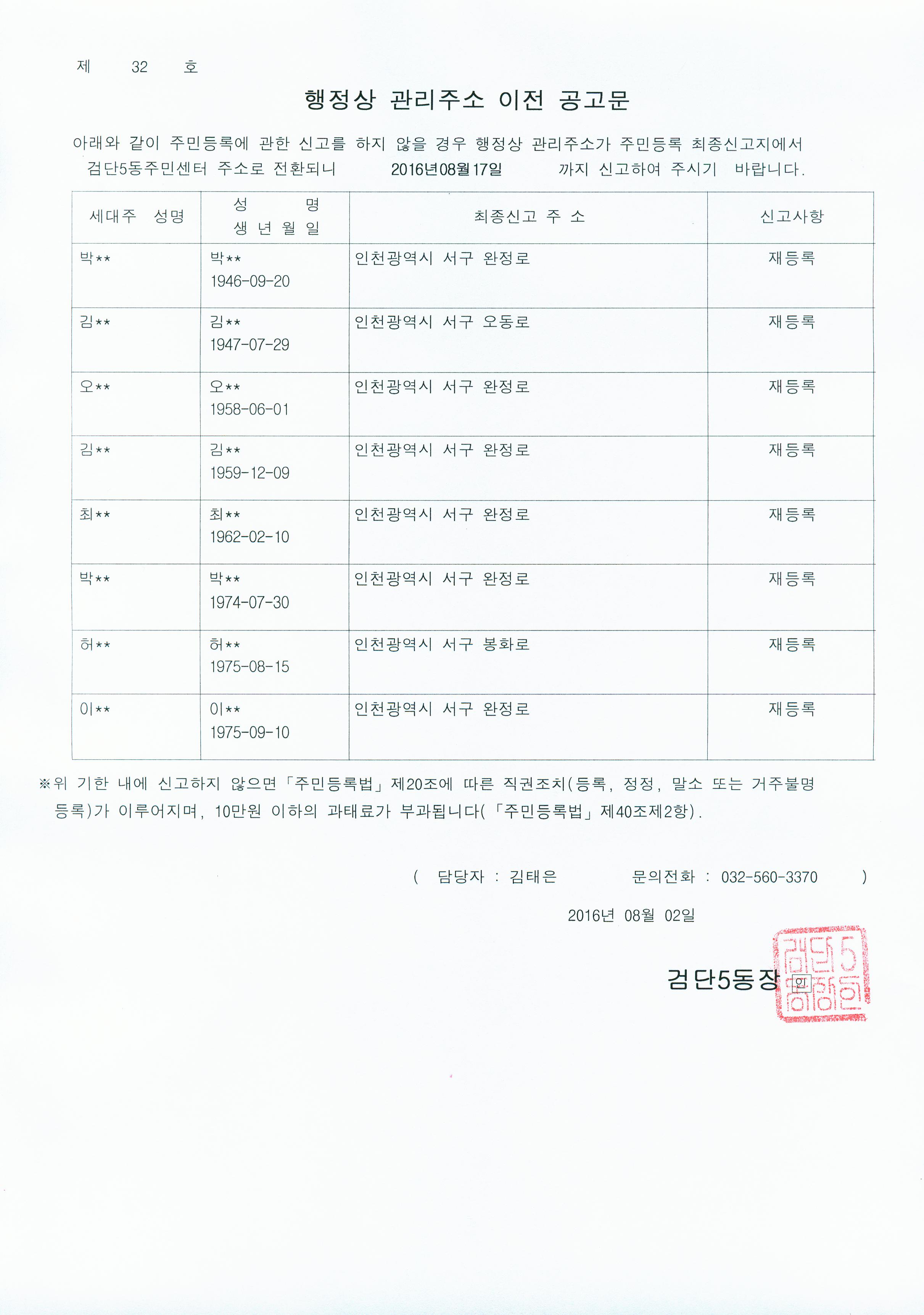 『주민등록법』제20조 제6항 및 부칙 제2조에 따라, 거주불명등록 후 1년이 경과한 거주불명자에 대해 아래와 같이 행정상 관리주소를 검단5동 주민센터로 이전하기 위하여 2차 공고합니다.