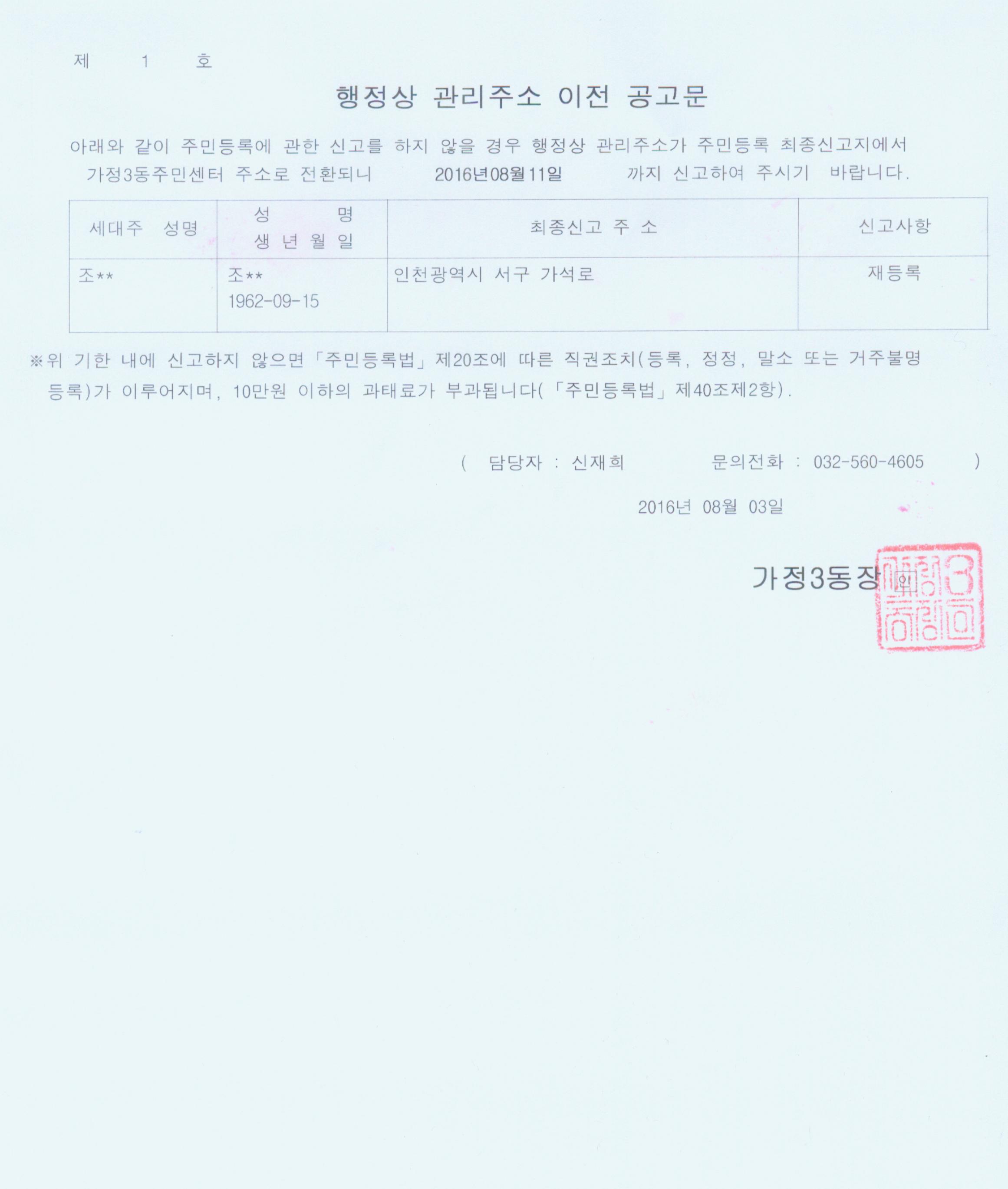 주민등록법 제20조 제6항에 의거, 직권거주불명등록되고 1년이 지나지 않은 자에 대하여 재산권자의 요구에 따라 아래와 같이 행정상 관리주소를 가정3동 주민센터로 이전하기 위하여 2차 공고합니다.