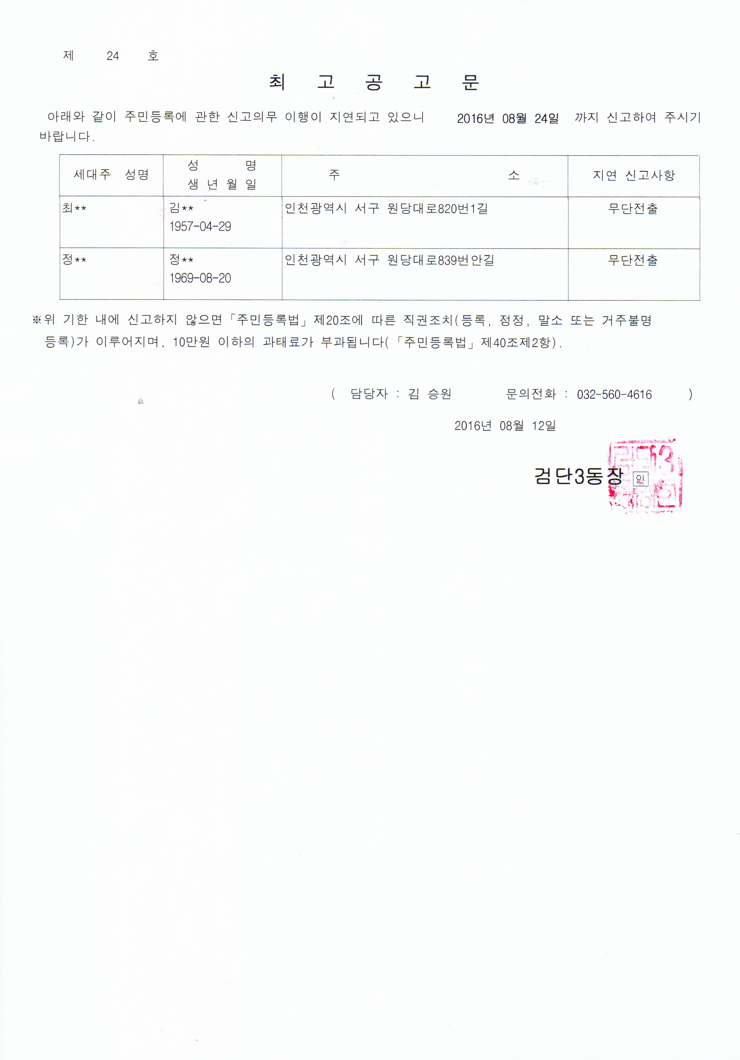 「주민등록법」제20조 제2항의 규정에 따라 주민등록 무단전출자에 대하여 최고하였으나 주소불명, 수취인