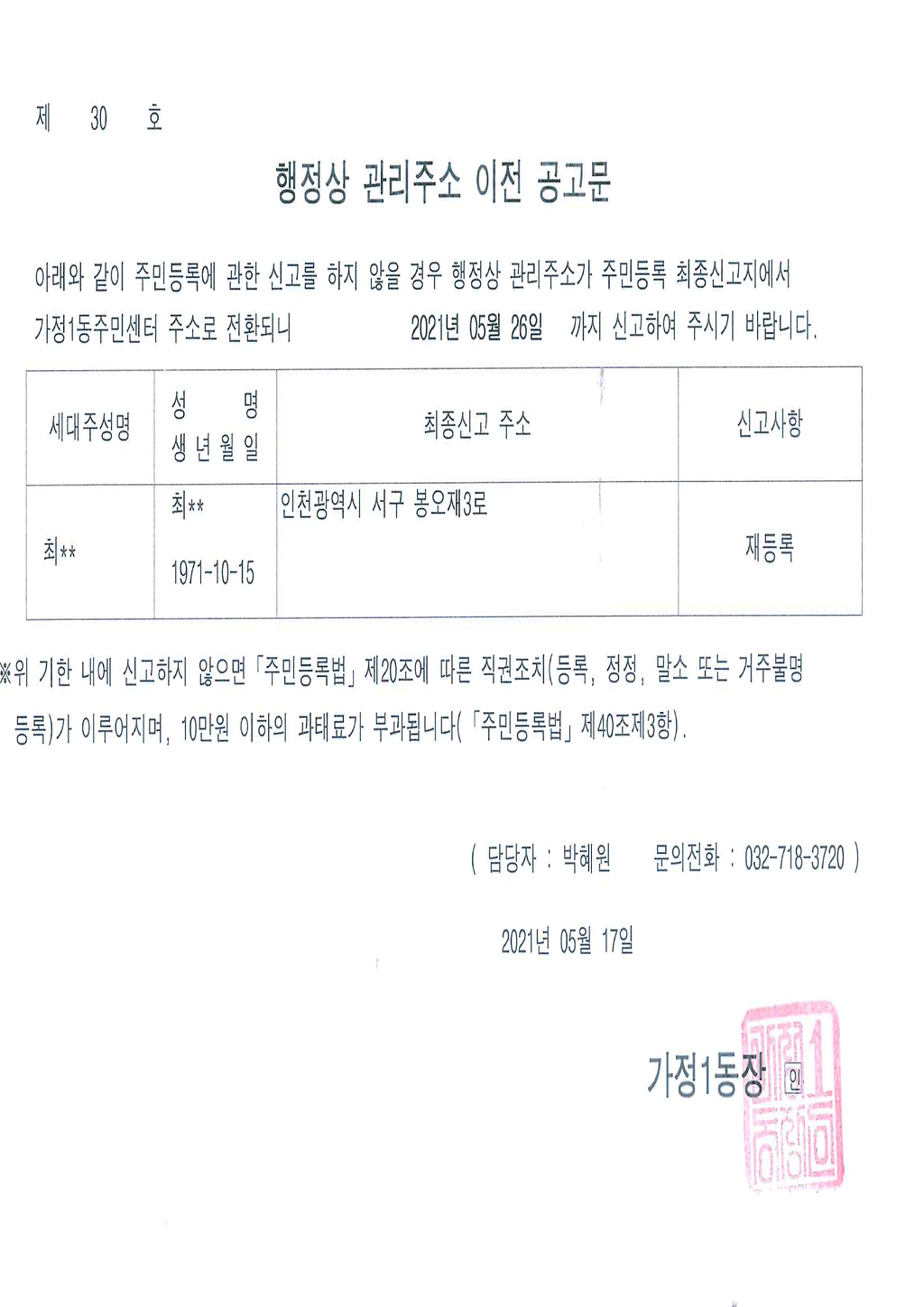 주민등록 거주불명자 행정상 관리주소 이전 공고(2차)