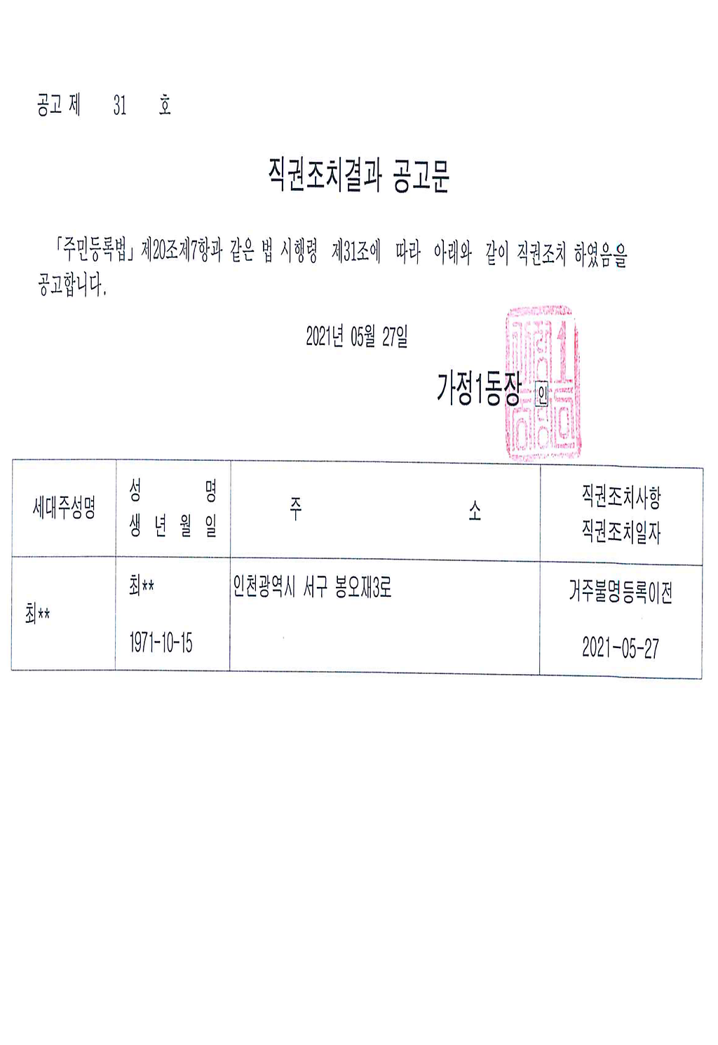 주민등록 거주불명등록자 행정상 관리주소 이전 (직권조치) 결과 공고