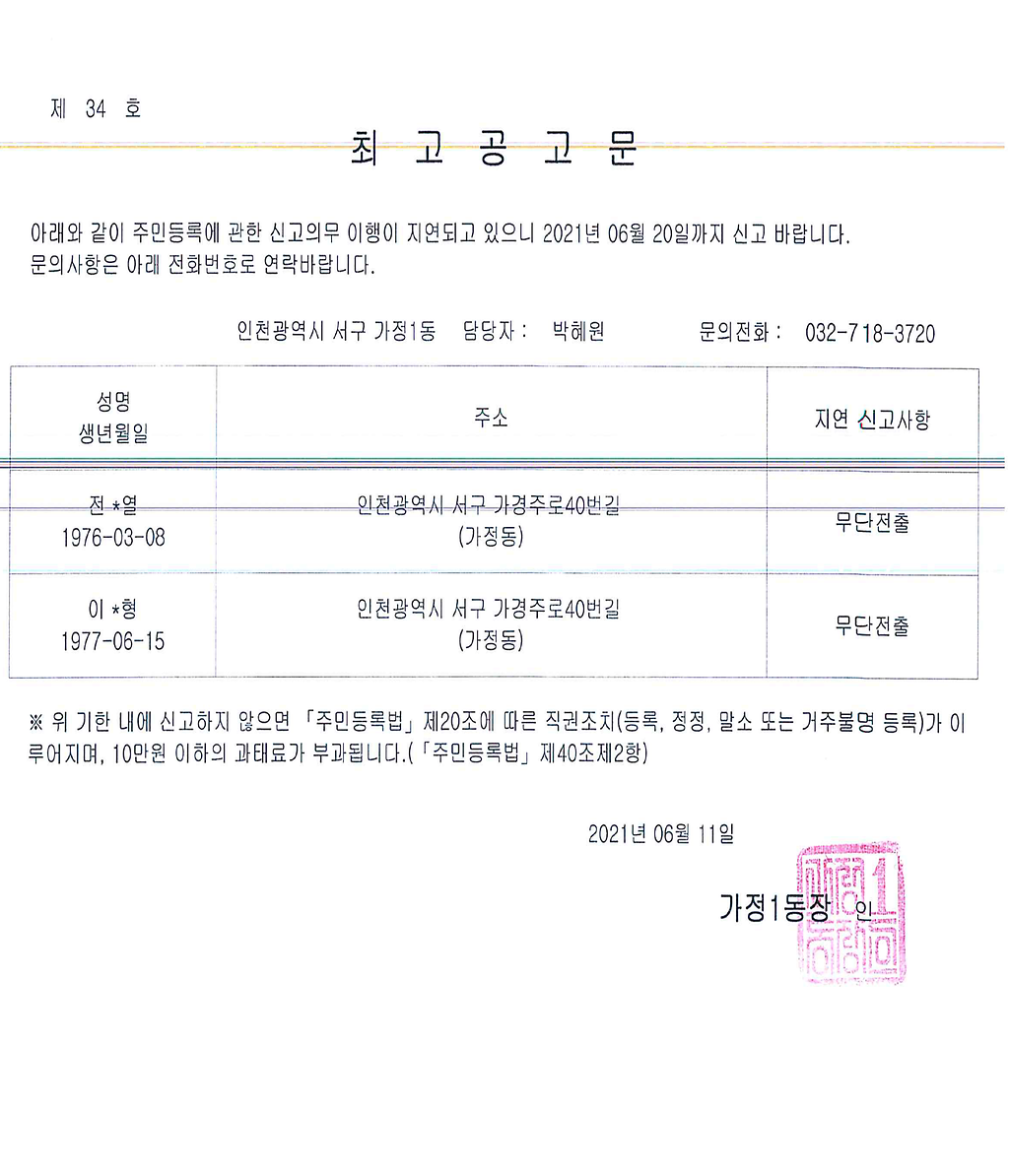 주민등록법 제20조 제2항의 규정에 따라 주민등록 무단전출자에 대하여 최고하였으나 주소불명, 수취인 미거주등의 사유로 반송되어 같은 법 시행령 제28조 제2항 규정에 따라 아래와 같이 [홈페이지] 및 [게시판]에 공고하고자 합니다.