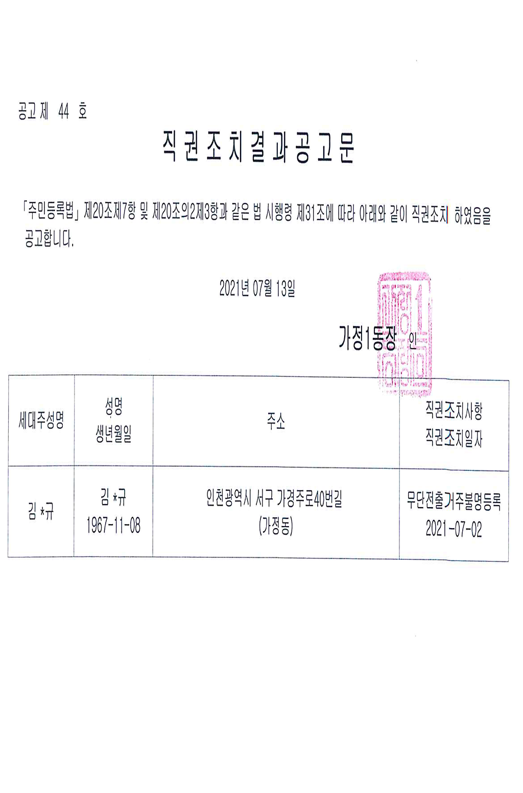 주민등록 무단전출자에 대하여 주민등록법 제20조 제7항 및 동법 시행령 제31조에 따라 직권조치하고 홈페이지 및 게시판에 아래와 같이 공고하고자 합니다.