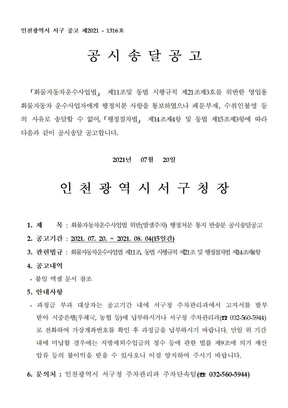 화물자동차운수사업법 위반(밤샘주차) 행정처분 통지 반송분 공시송달 공고