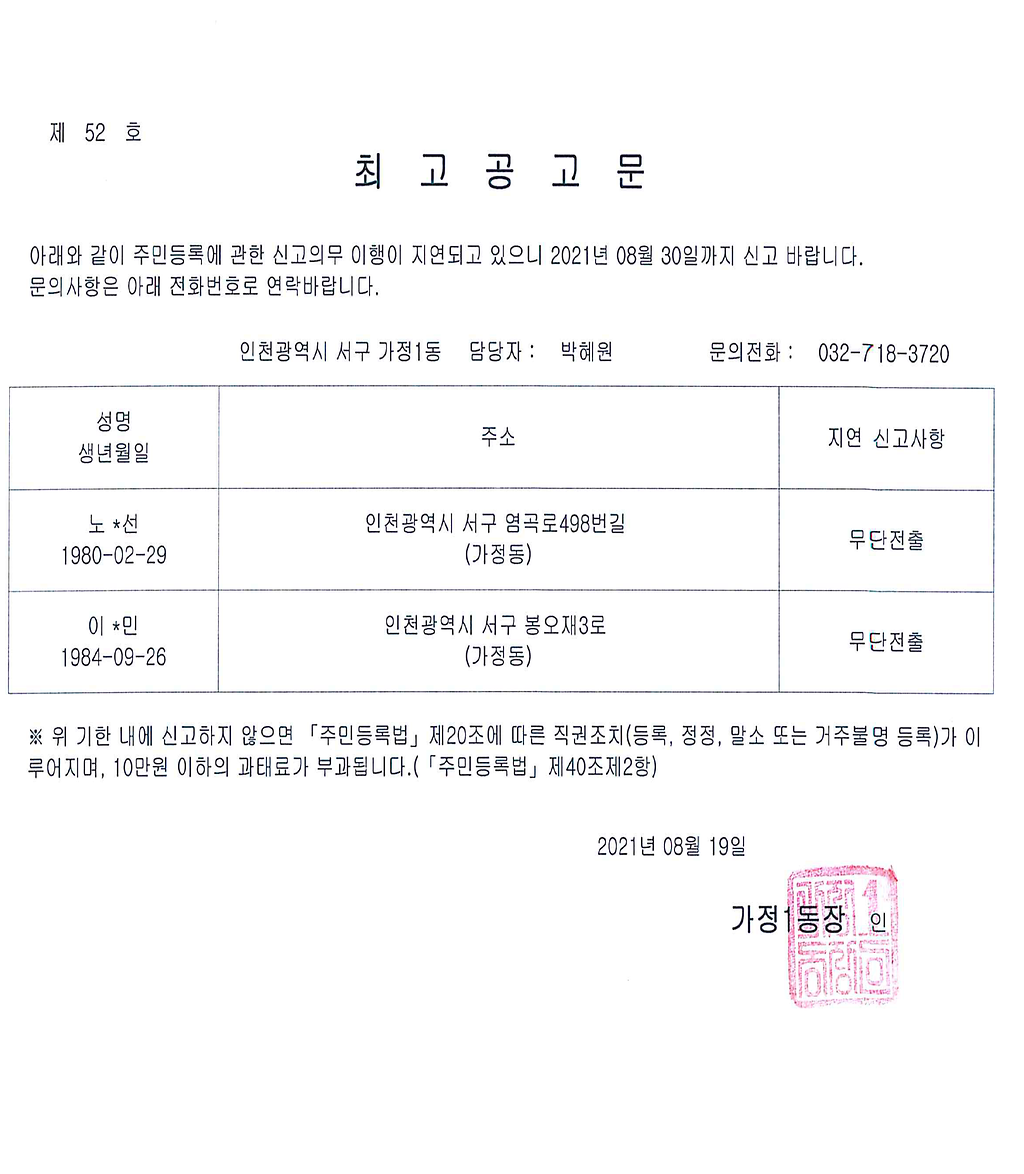 주민등록법 제20조 제2항의 규정에 따라 주민등록 무단전출자에 대하여 최고하였으나 주소불명, 수취인 미거주등의 사유로 반송되어 같은 법 시행령 제28조 제2항 규정에 따라 아래와 같이 [홈페이지] 및 [게시판]에 공고하고자 합니다.