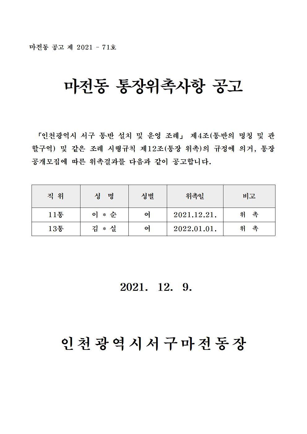마전동 11통, 13통 통장 위촉 공고