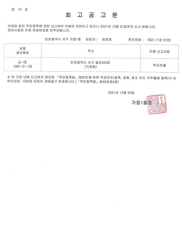 주민등록 무단전출자에 대한 최고공고