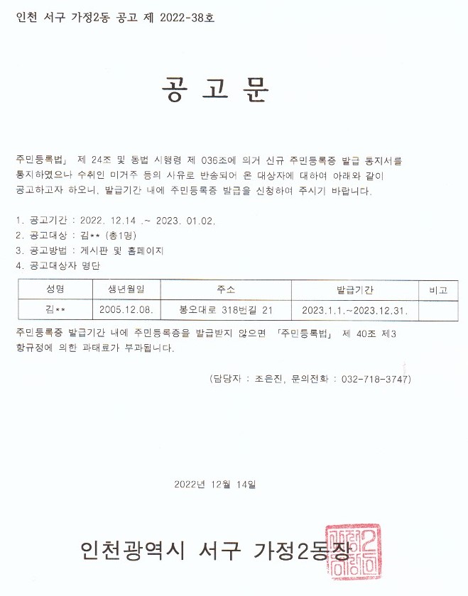 주민등록법 제24조 제5항 및 동법 시행령 제36조 제1항의 규정에 의거 신규 주민등록증 발급 신청 통지서를 배달증명으로 통지하였으나, 수취인 부재 등으로 발급통지서가 반송된 자에 대하여 붙임과 같이 동홈페이지와 게시판에 공고하고자 합니다.