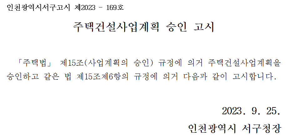 주택건설사업계획 승인 고시[검단신도시 AA22블록]