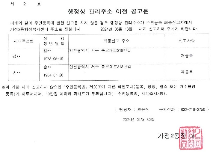 주민등록법 제20조제6항 및 부칙 제2조에 의거, 거주불명등록 후 1년이 경과한 거주불명등록자에 대하여 행정상 관리주소를 동 행정복지센터로 이전하기 위한 2차 공고를 실시하고자 합니다.