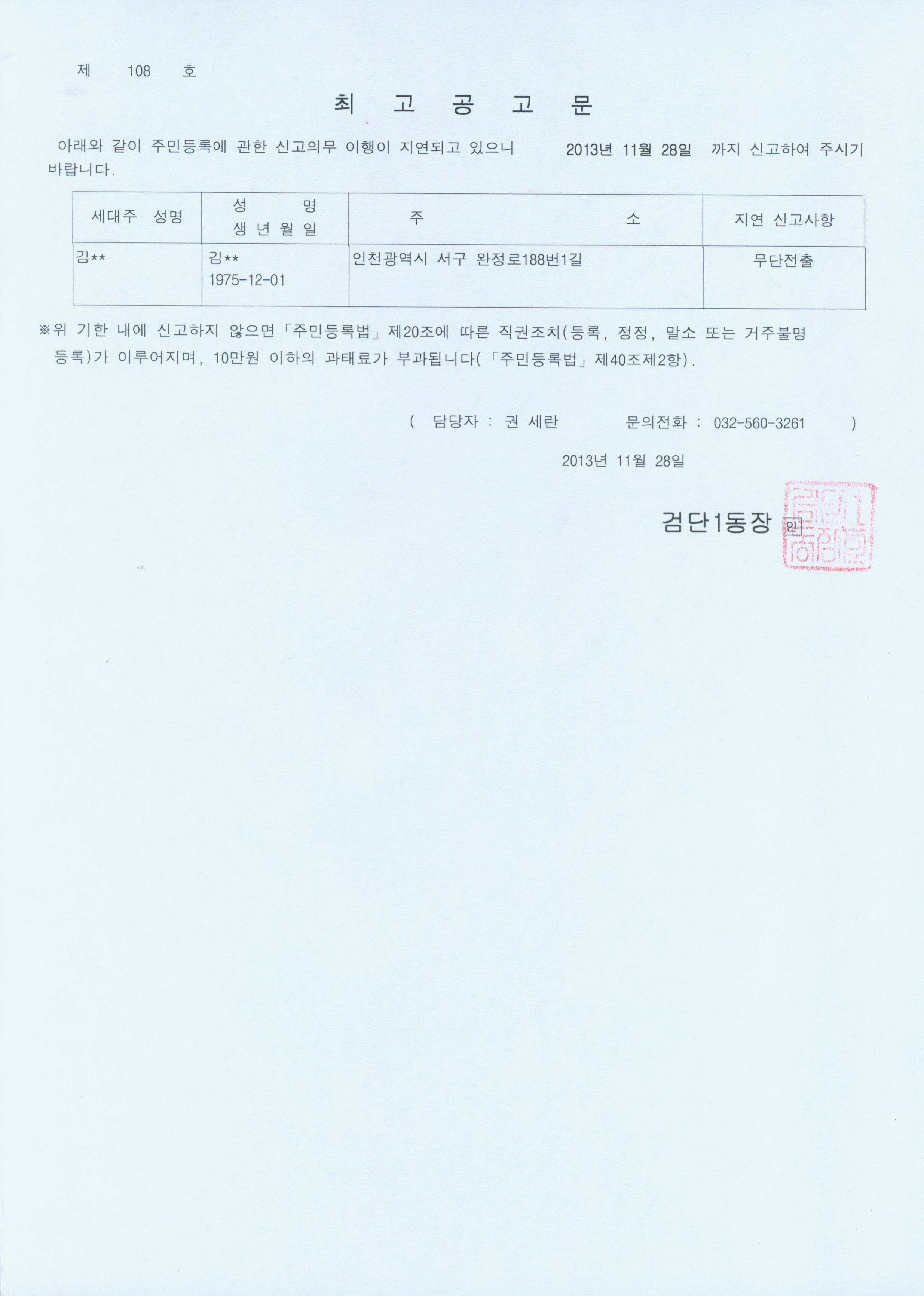 주민등록 무단전출자에 대해 주민등록법 제20조 및 동법시행령 제28조의 규정에 의거 일정기간 내에 신고하도록 최고를 하였으나, 최고장의 반송으로 해당 무단전출자에 대한 최고공고문을 아래와 같이 [홈페이지] 및 [게시판]에 공고하고자합니다.