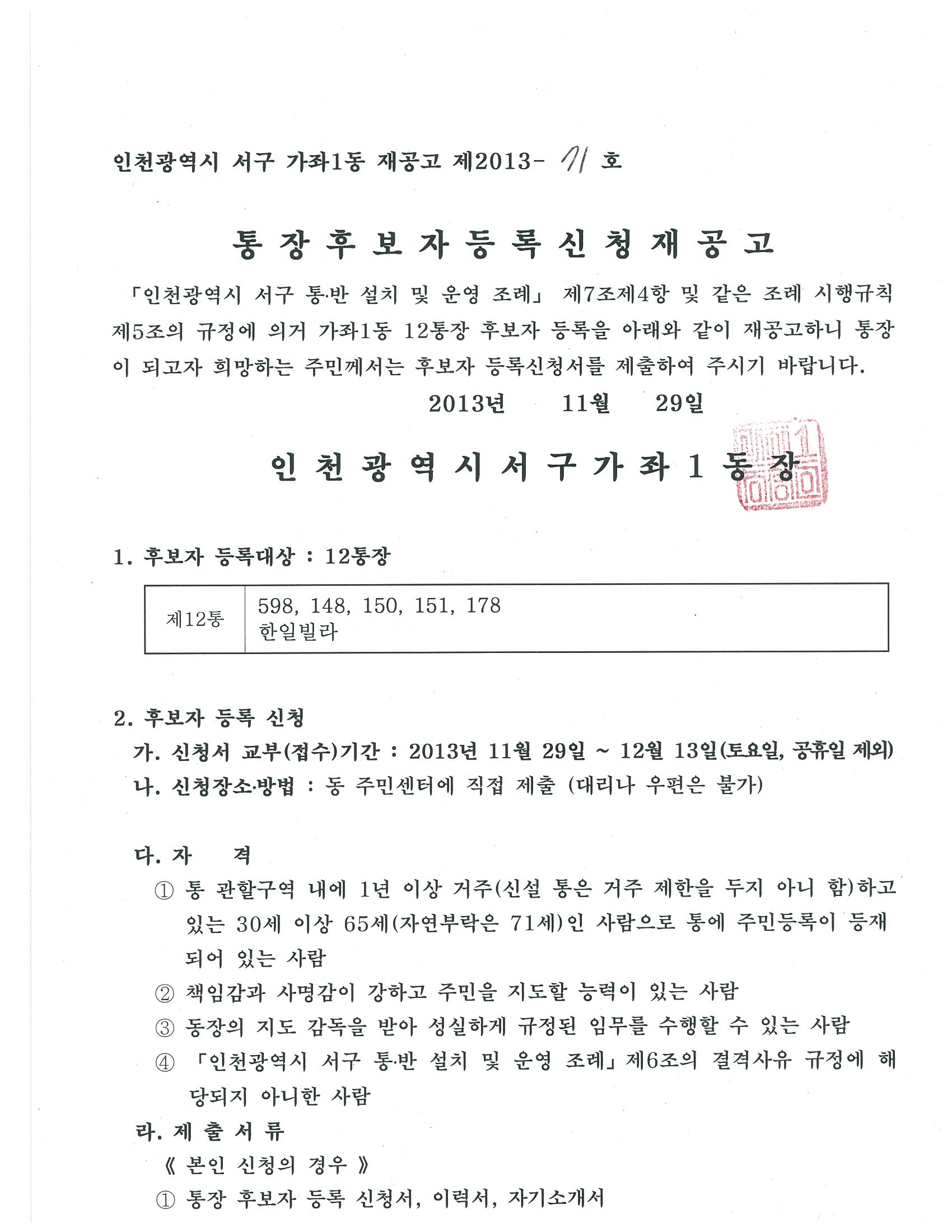 접수 마감한 결과 12통의 접수자가 없어 재공고를 통해 해당통의 통장을 투명하고 공정하게 선출하고자
