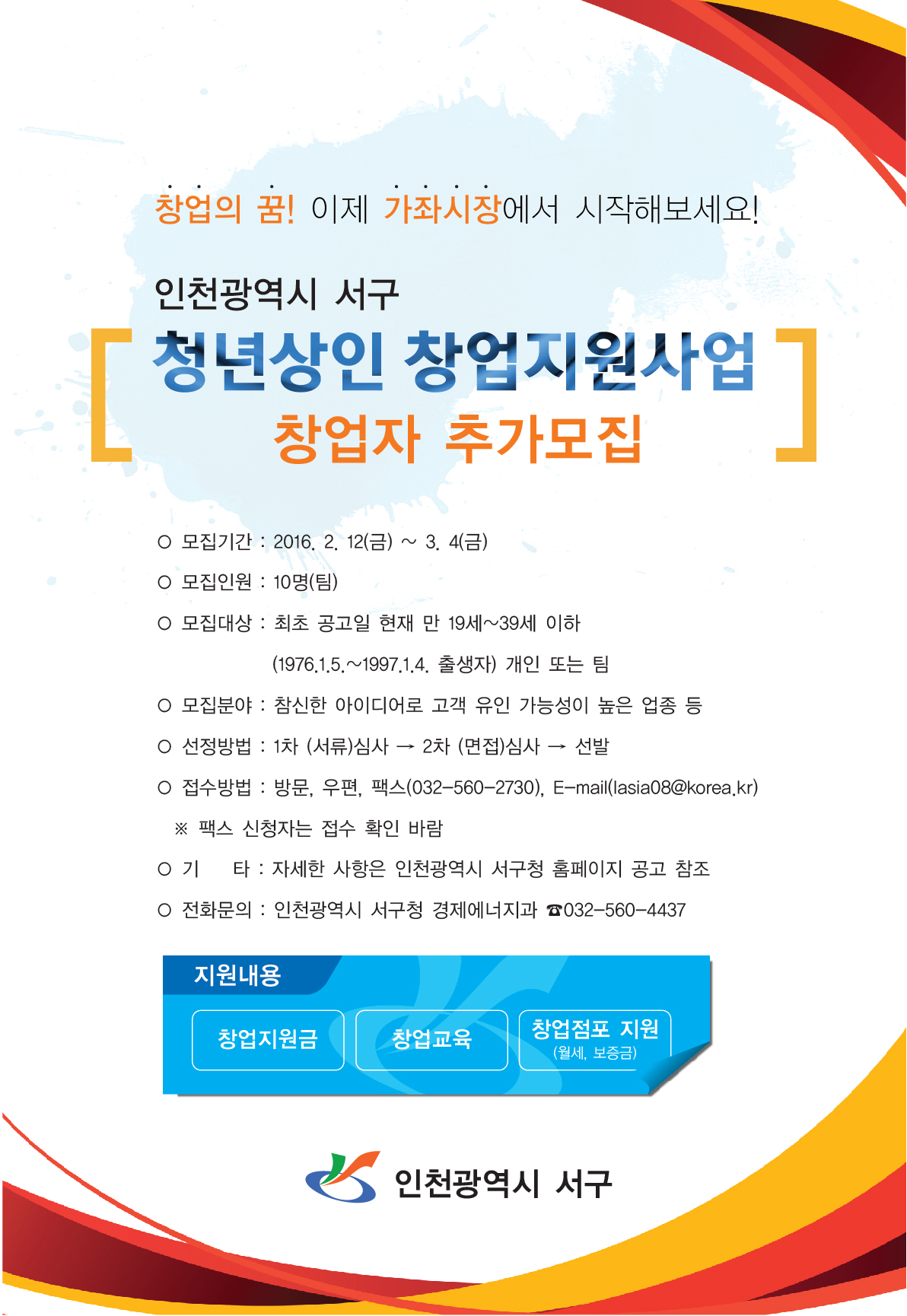 가좌시장 내 2층 점포(인천 서구 원적로96번길 16, 2층)를 임대하여 청년상인 유입을 통한 전통시장 및 지역경제 활성화를 도모하고자 우리 구에서 추진중인 『청년상인 창업지원사업』 창업자 모집기간을 연장하여 공고하오니 많은 참여 바라며, 자세한 사항은 붙임의 공고문을 참고하여 주시기 바랍니다.
