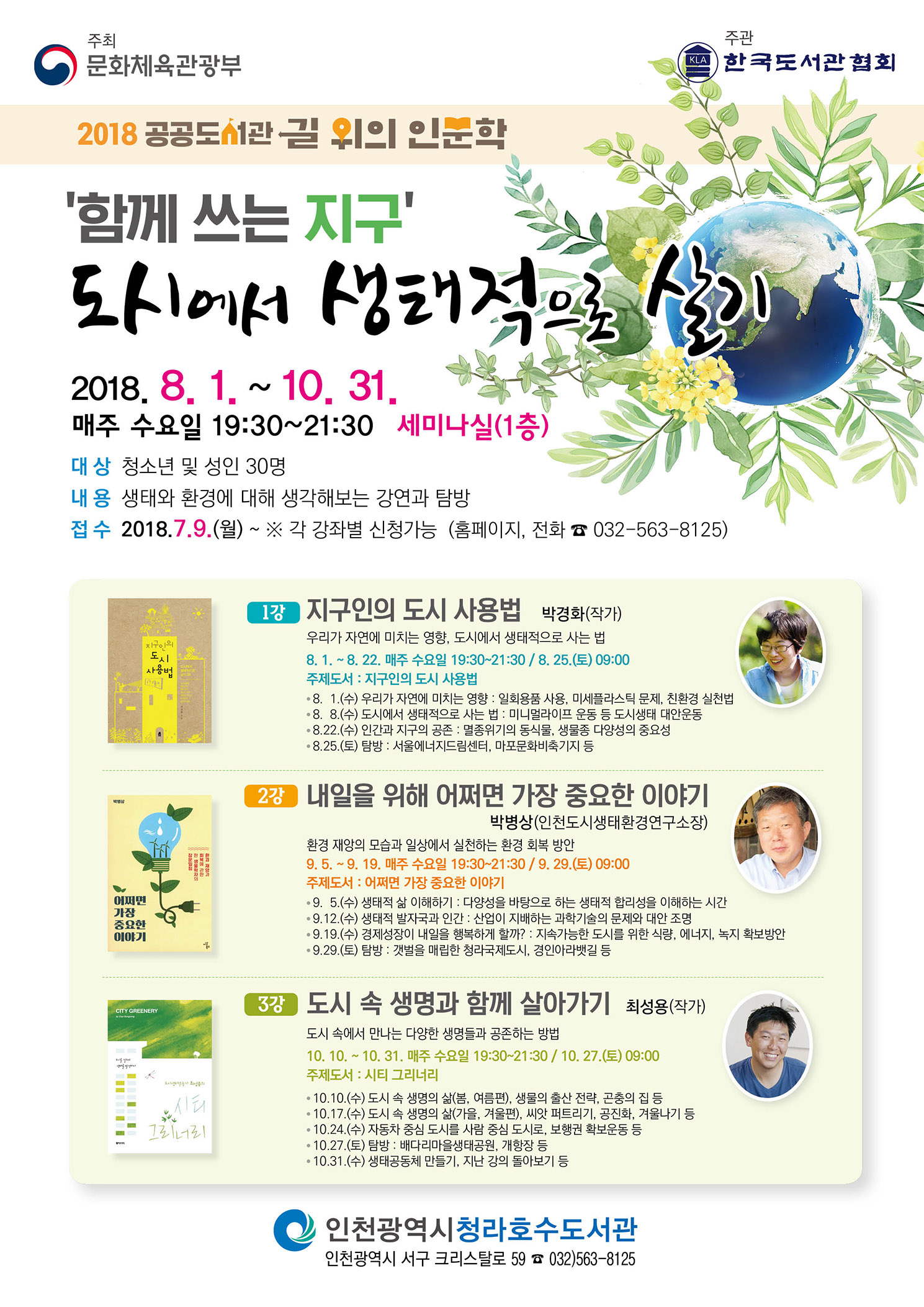 청라호수도서관에서는 2018년 공공도서관 (길 위의 인문학)사업으로 "함께 쓰는 지구 : 도시에서 생태적으로