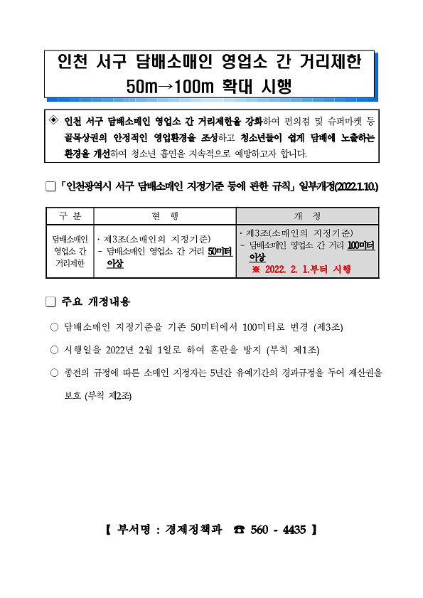 인천 서구 담배소매인 영업소 간 거리제한 100m 확대 시행 안내