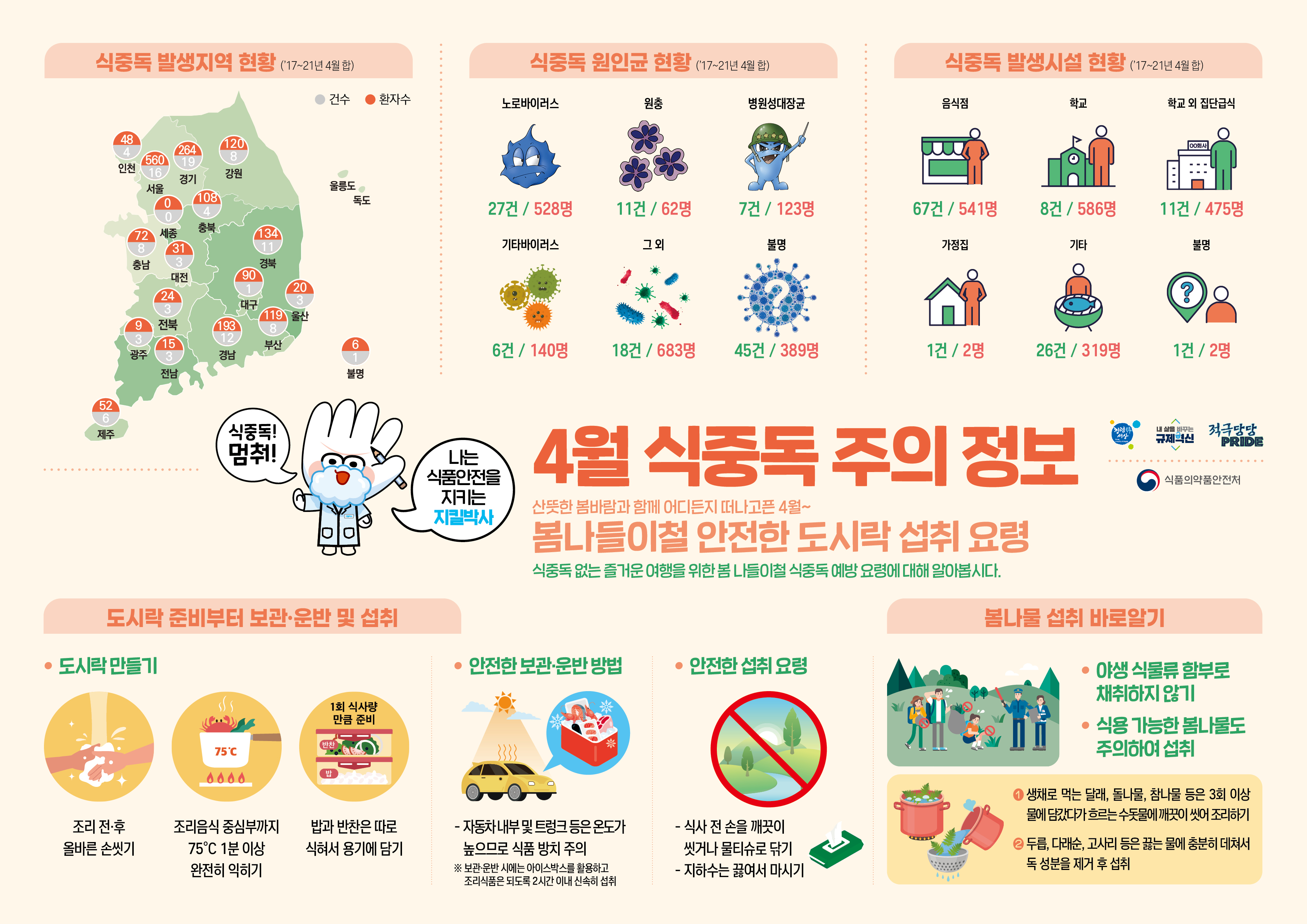 - 4월은 지역 꽃 축제 등 나들이 하기 좋은 계절로, 자동차 내부 및 트렁크 등은 온도가 높아 도시락 등 음식물 방치로 인한 식중독 발생에 주의가 필요합니다. 또한, 식용이 불가능한 야생 식물을 함부로 채취하지 않아야하며, 식용이 가능한 봄나물도 섭취에 주의가 필요합니다.
