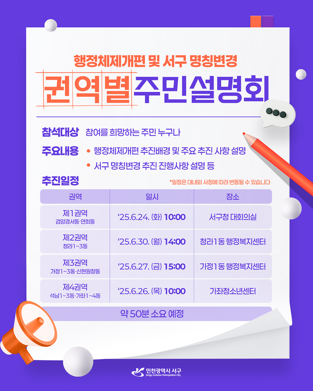 인천형 행정체제 개편 추진과 관련, 서구지역 권역별 주민설명회를 개최하여