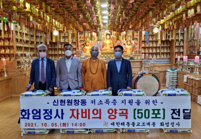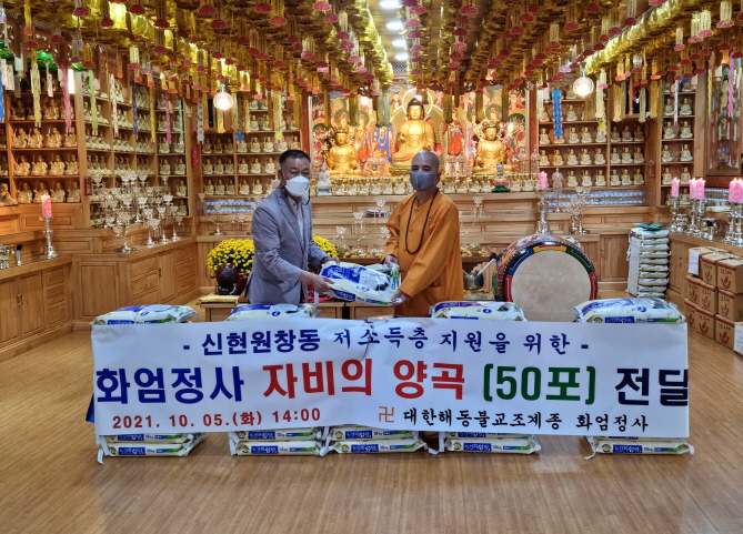 사단법인 대한해동불교조계종 화엄정사(주지 보광스님)는 지난 5일 지역 내 저소득 취약계층을 위한 양곡 10kg 50포를 신현원창동 행정복지센터(동장 이규천)에 전달했다고 밝혔다.