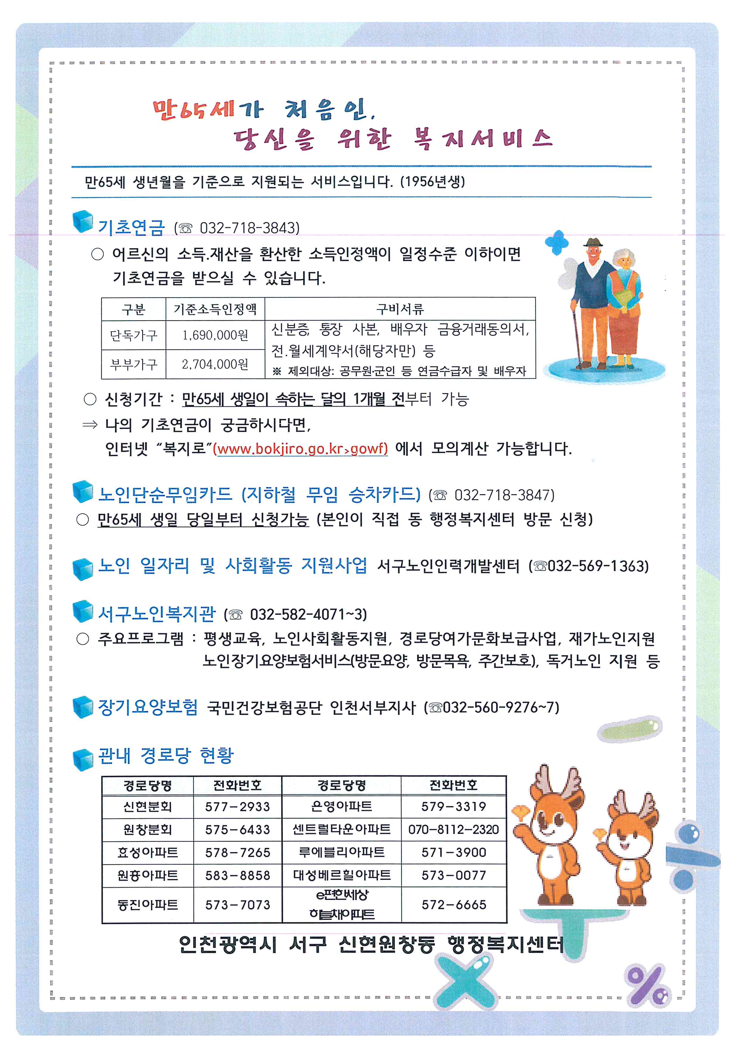인천 서구 신현원창동(동장 이규천)이 만 65세 이상 주민이 나이에 따라 지원받을 수 있는 복지 혜택을 모르고 지나가지 않도록 적극 홍보에 나선다.