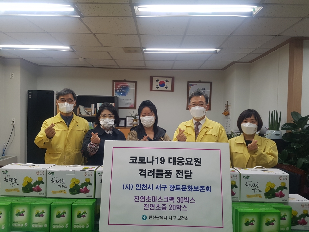 (사)인천서구향토문화보존회(회장 최미희)는 지난 17일 코로나 대응과 선별 진료 등으로 고생하는 의료진과 직원을 응원하기 위해 서구보건소(소장 김봉수)를 방문해 마스크팩, 건강식품 등 격려물품을 전달했다고 22일 밝혔다.
