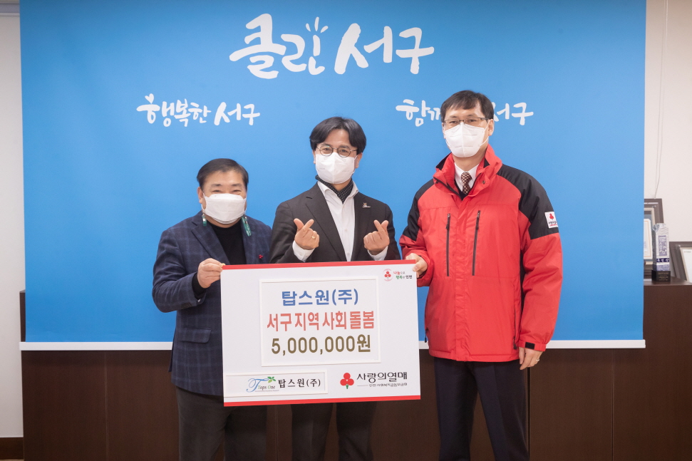홍성유 탑스원(주) 대표는 “연초를 맞아 힘든 시기를 보내고 있을 서구 주민들과 따스한 마음을 나누고 싶다”며 “모두가 어려운 시기지만 함께 힘을 내 이겨내기를 바란다”고 전했다.