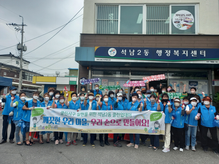 인천 서구 석남2동(동장 인혜진) 행정복지센터는 지난 17일 오전 쾌적한 환경 조성을 위한 ‘6월 클린업데이’ 행사를 진행했다. 이날 행사에는 석남2동 통장자율회(회장 오순석) 회원 30여 명과 새마을부녀회(회장 이영숙) 회원 10여 명, 동 직원 등이 함께했다.