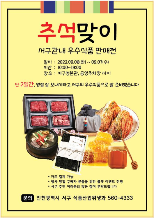 인천 서구(구청장 강범석)는 추석 명절을 맞이해 오는 6, 7일 이틀간 서구청 후문 마실거리에서 ‘추석맞이 관내 우수식품 판매점’을 개최한다고 1일 밝혔다.