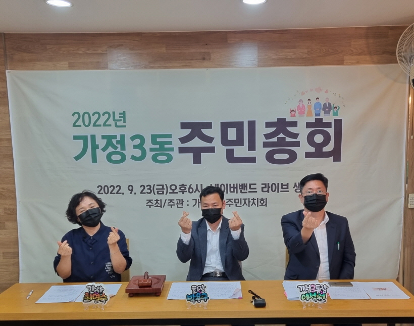 가정3동 주민자치회 온라인 커뮤니티를 통해 생중계로 진행된 이번 주민총회는 박용구 주민자치회장의 개회선언을 시작으로 2022년 실행사업 추진 보고, 2023년 자치계획 공유 및 마을사업에 대한 선호도 투표, 최종 주민투표 결과발표순으로 이뤄졌다.