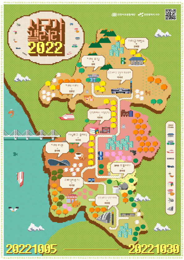 ○ 전 시 명 : <2022 서구가 갤러리> ○ 기 간 : 2022년 10월 5일(수) ~ 10월 30일(일) [총25일] *휴관일 : 공간 별 상이 ○ 장 소 : 인천 서구 지역 내 총 10개의 장소 *자세한 위치는 홈페이지 및 전시 리플렛 참조 ○ 참 여 작 가 : 강혜정, 김문선, 문지혜, 이기라, 이기영, 이시내, 이주희, 청화, 최유림 한아영 총 10명 ○ 대 상 : 인천구민 등 ○ 관 람 료 : 무료 *지하철 정류장의 경우 교통비 발생 ○ 주 관 : 인천서구문화재단 ○ 주 최 : 인천 서구청 |