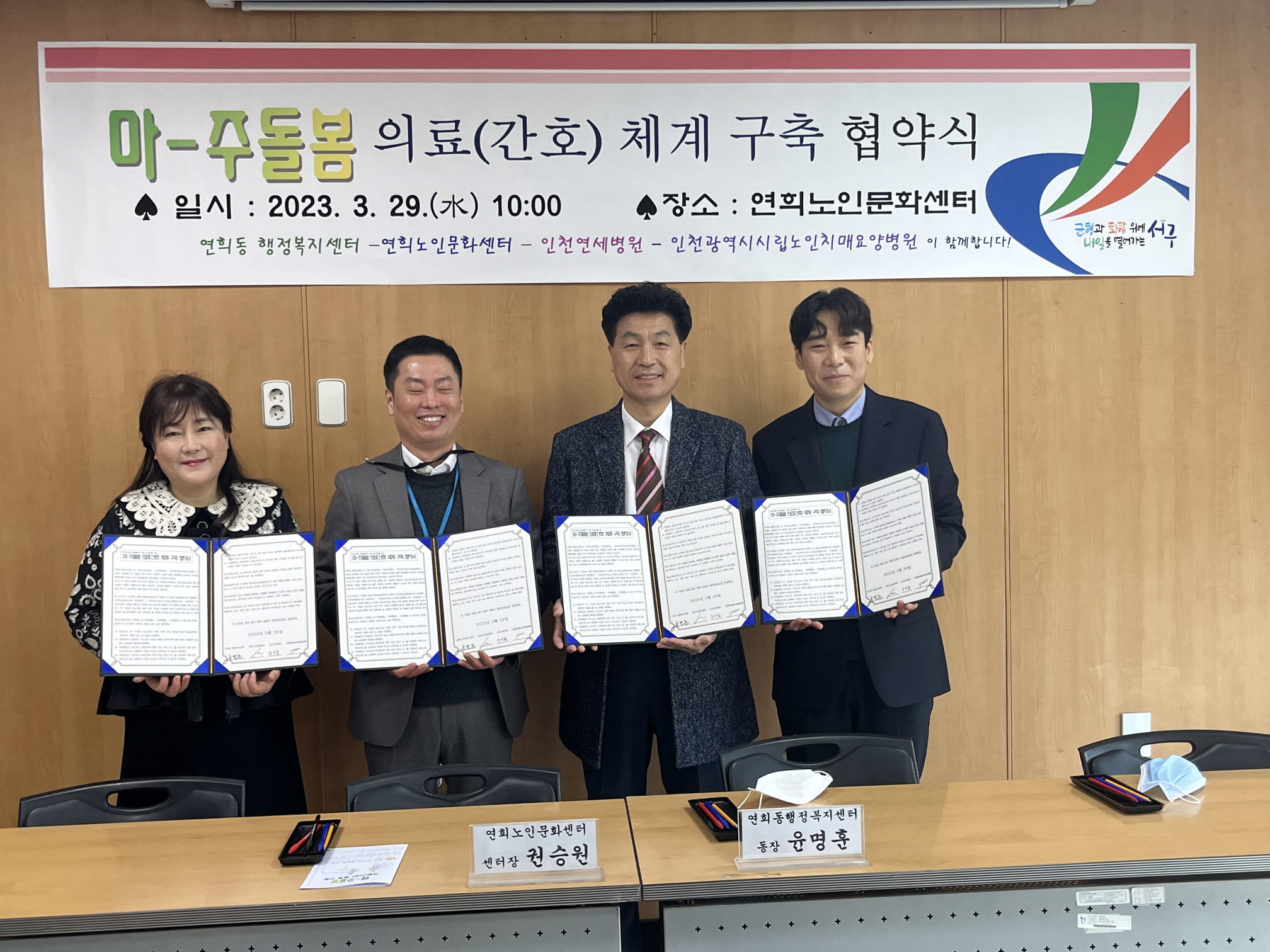 인천 서구 연희동 행정복지센터(동장 윤명훈)가 연희노인문화센터, 인천연세병원, 시립노인치매요양병원과 업무협약을 체결하고 의료·간호 사업을 공동 추진한다고 30일 밝혔다.