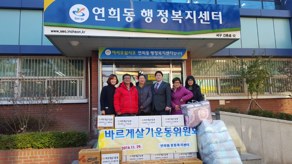 인천 서구 연희동 바르게살기운동위원회(위원장 임효철)는 지난 11월 29일 연희동 행정복지센터(동장 백용석)에 이웃사랑 나눔 물품으로 김장김치와 라면 및 겨울철 따뜻한 잠자리를 책임질 극세사 이불을 전달하였다.