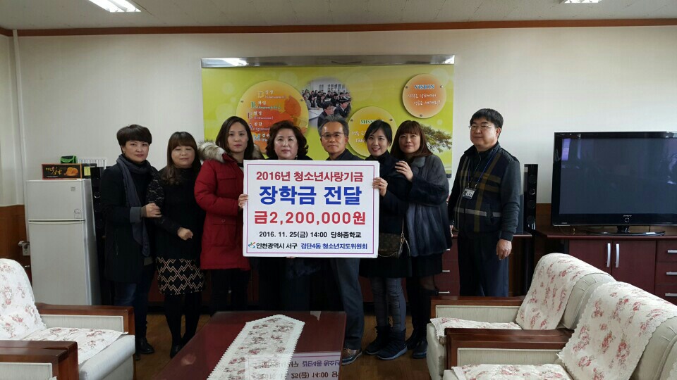 검단4동 청소년지도위원회(위원장 한규호)는 지난 11월 25일 관내 청소년을 위해 마전중학교(교장 전종공)와 당하중학교(교장 서효숙)에 각각 청소년사랑기금 각각 장학금 280만원, 220만원을 전달하였다.