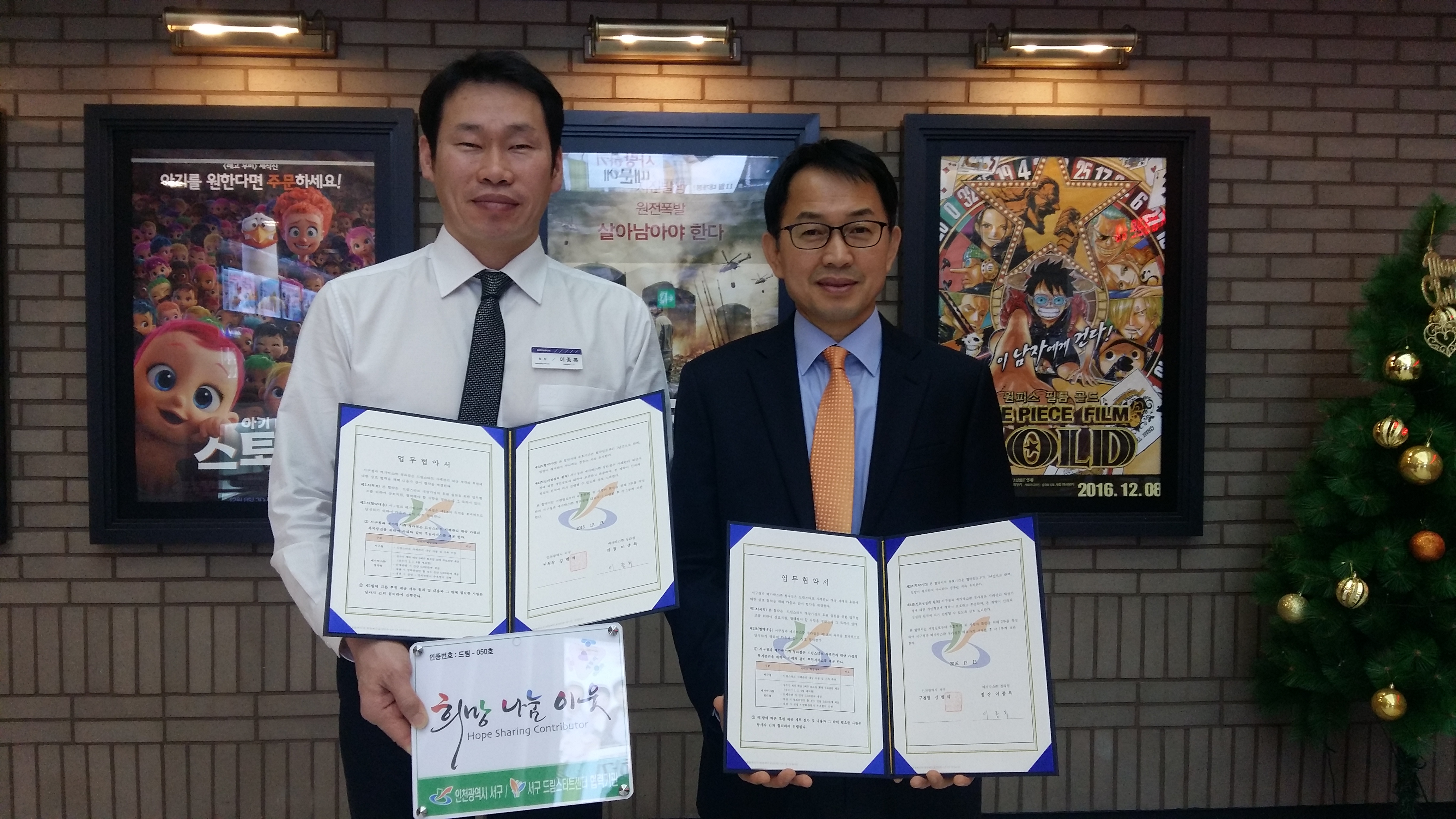 이날 메가박스 청라점에서 체결된 업무협약은 양찬석 희망복지과장, 이종복 메가박스 청라점장이 참석한 가운데 이루어졌으며 이번 협약으로 매월 30명의 드림스타트 아동과 가족이 무료로 영화를 관람할 수 있게 되었다.