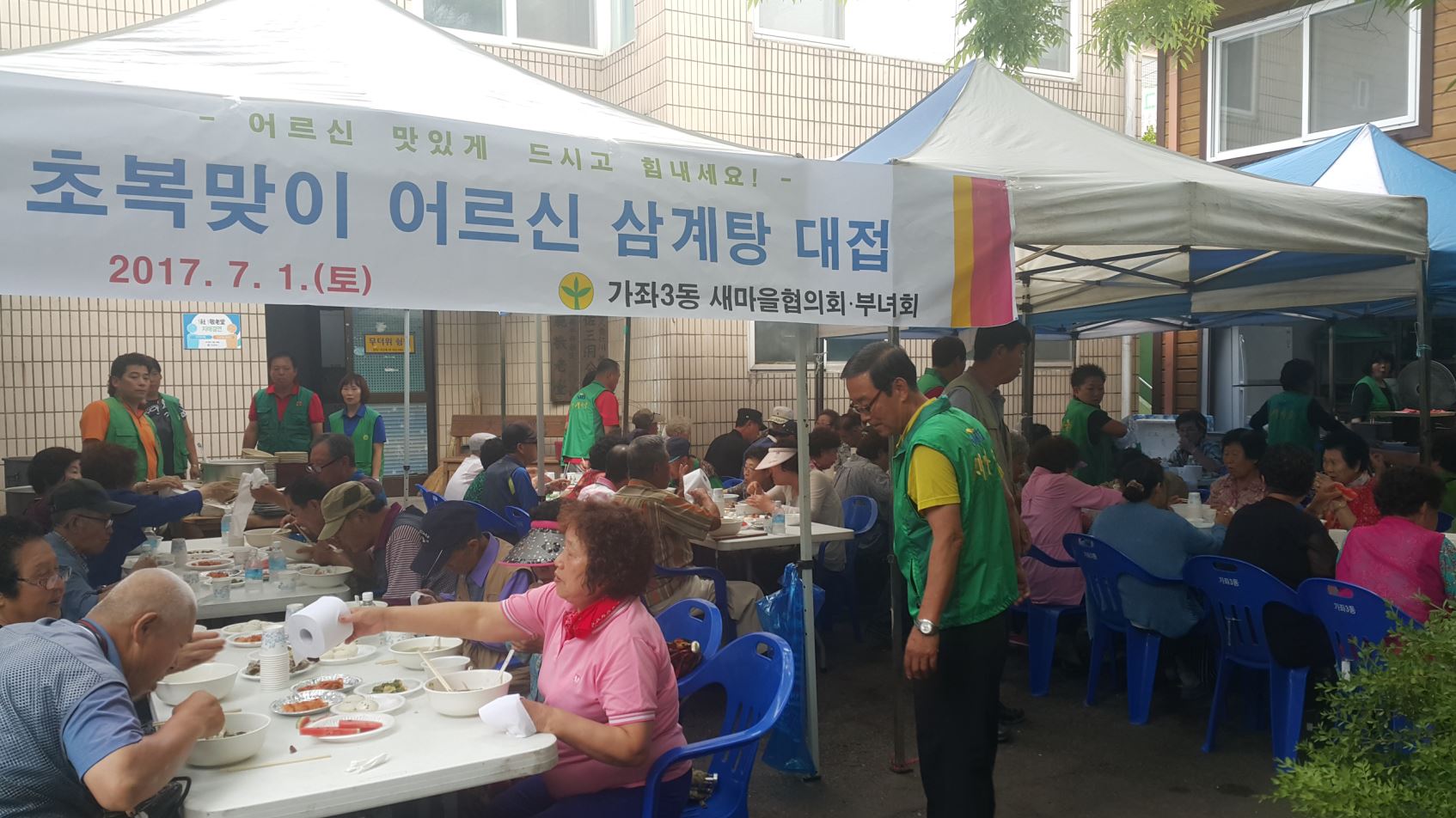 인천 서구 가좌3동 새마을협의회(회장 이재석)와 새마을부녀회(회장 김옥화)는 지난 1일 초복을 맞이하여 관내 어르신 200여명을 모시고 가좌3동 경로당 앞마당에서 삼계탕 대접 행사를 가졌다.