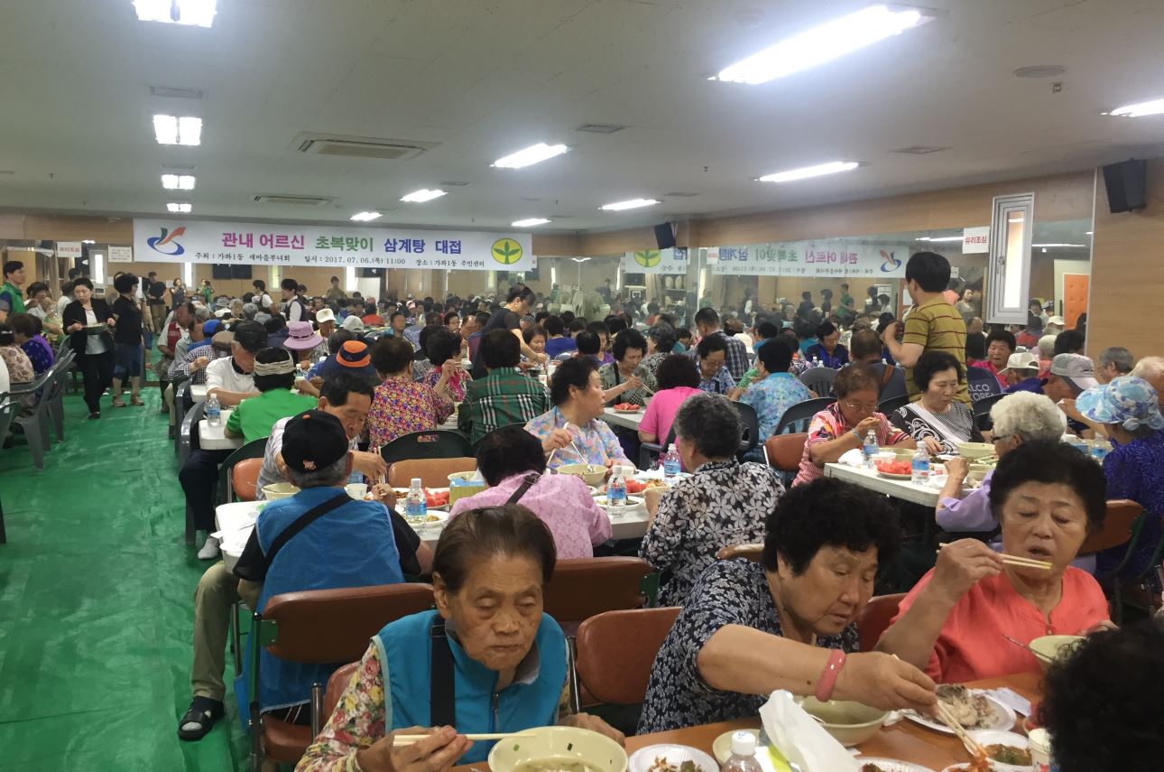 이날 행사는 초복을 맞이하여 장마철과 혹서기로 인해 허약해지기 쉬운 어르신들이 여름철을 건강하게 보내실 수 있도록 새마을부녀회의 따뜻한 마음을 담아 정성스럽게 마련한 삼계탕을 관내 어르신 400여명에게 대접했다.