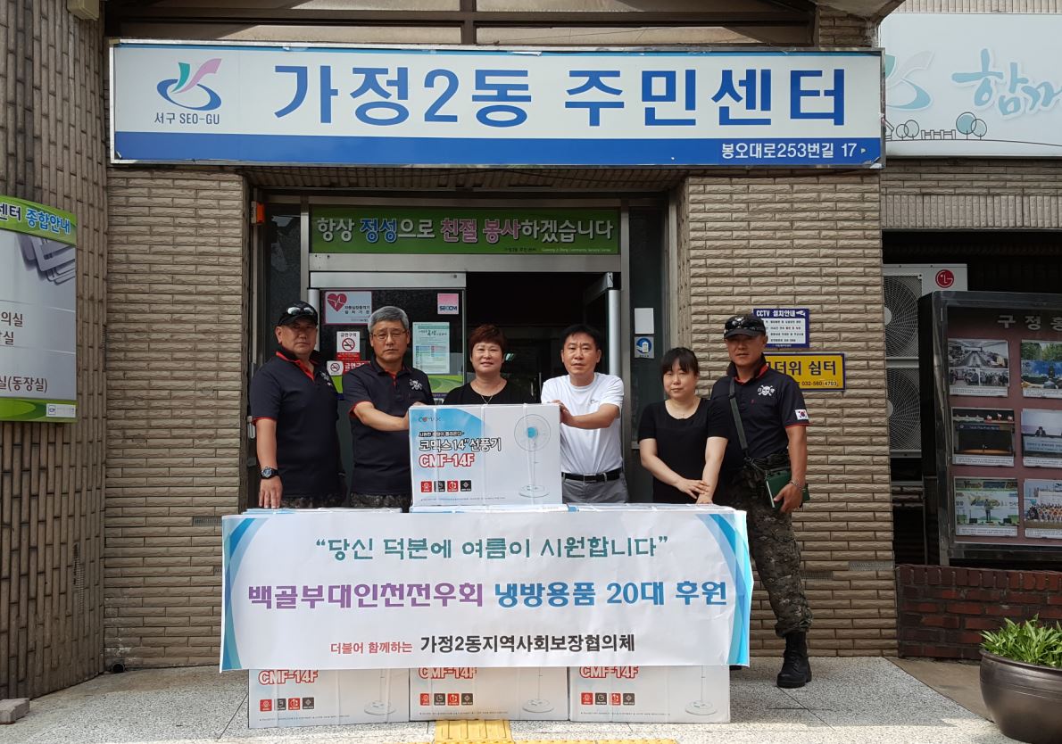 대한민국백골부대인천전우회(회장 이상은)는 지난 12일 취약계층 어르신들이 여름을 시원하게 보낼 수 있도록 선풍기 20대를 가정2동 지역사회보장협의체(위원장 김원상, 민간위원장 주일분)에 전달했다.