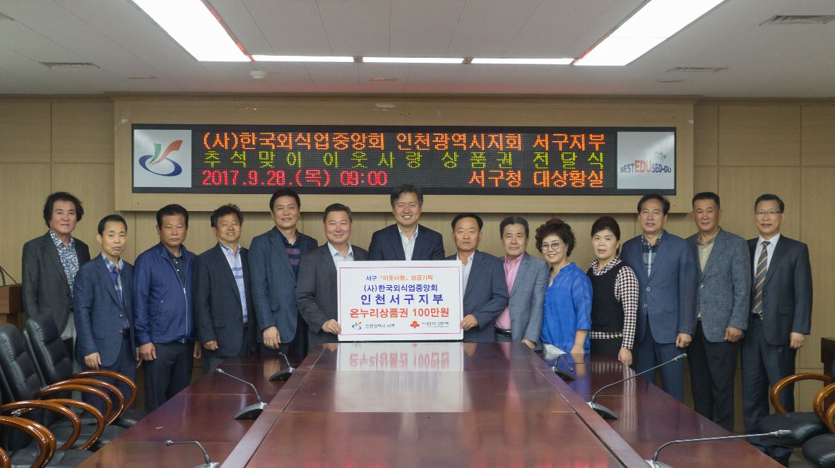 우리 고유의 명절 추석을 맞이하여 (사)한국외식업중앙회 인천광역시지회 서구지부장 조귀정(희래등 대표)은 사무국장 및 운영위원들과 함께 이웃사랑 실천을 위한 성금으로 온누리상품권 일백만원을 서구청에 기탁했다.