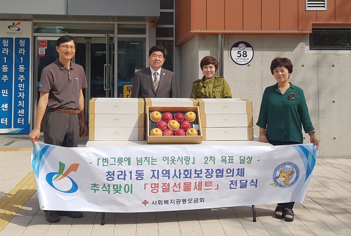 인천 서구 청라1동 지역사회보장협의체는 지난 27일 ‘빈그릇에 넘치는 이웃사랑’ 캠페인 2차 목표(빈그릇 인증샷 누적 2,000건) 달성을 기념해 관내 저소득 가구(10세대)에 명절선물세트(과일세트 50만원 상당)를 전달했다.