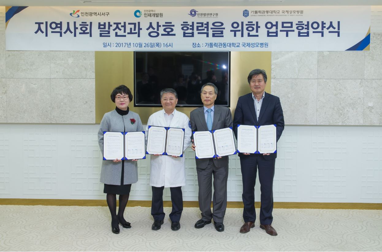 인천시 서구(구청장 강범석)는 지난 26일 인천시 인재개발원, 인천발전연구원, 가톨릭관동대학교 국제성모병원과 ‘지역사회 발전과 상호 협력을 위한 업무협약’을 체결했다고 밝혔다.