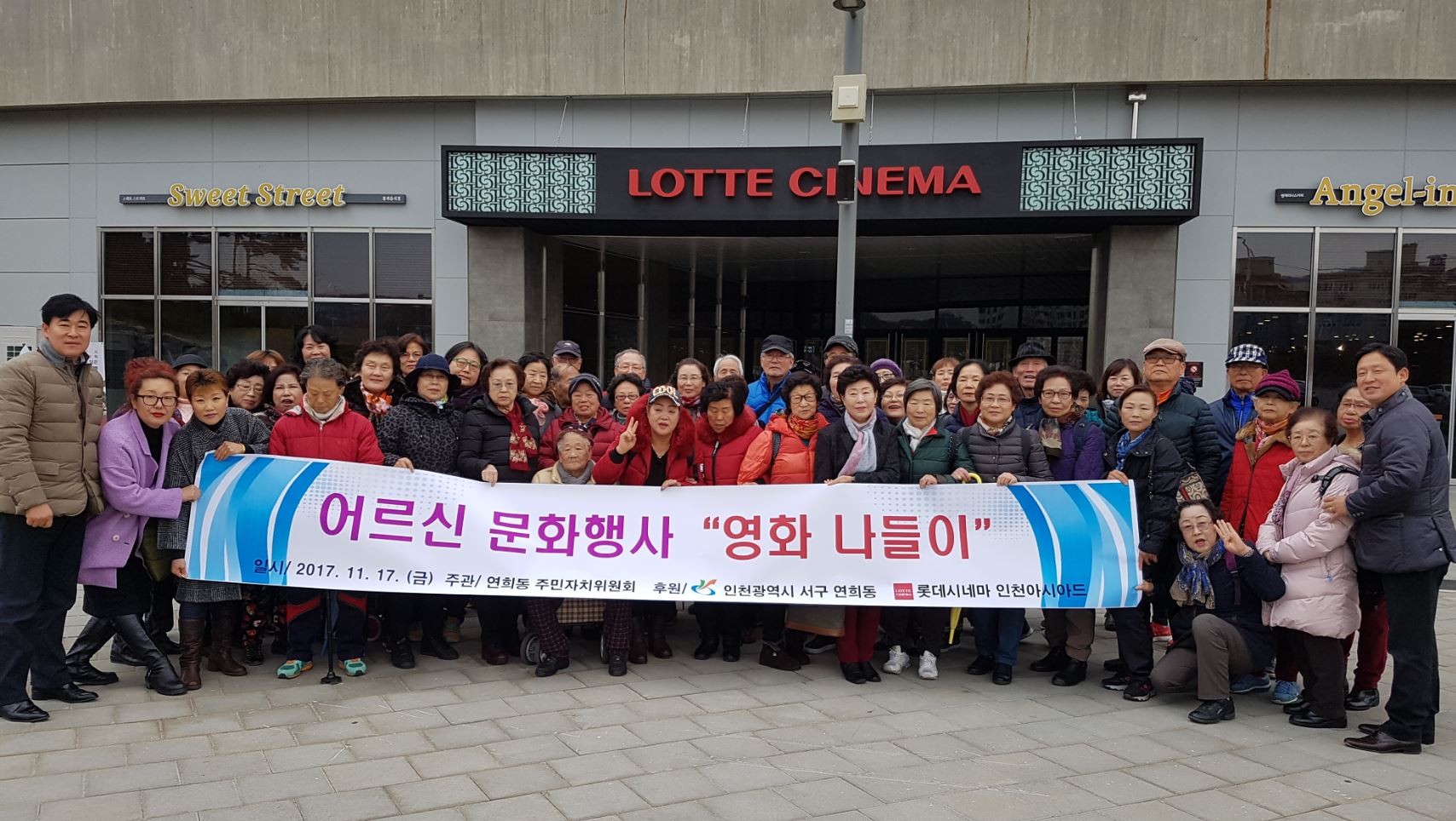 인천시 서구 연희동주민자치위원회(위원장 조은상)는 지난 17일 관내 어르신과 인솔자 60여명을 대상으로 무료 영화관람을 지원했다.