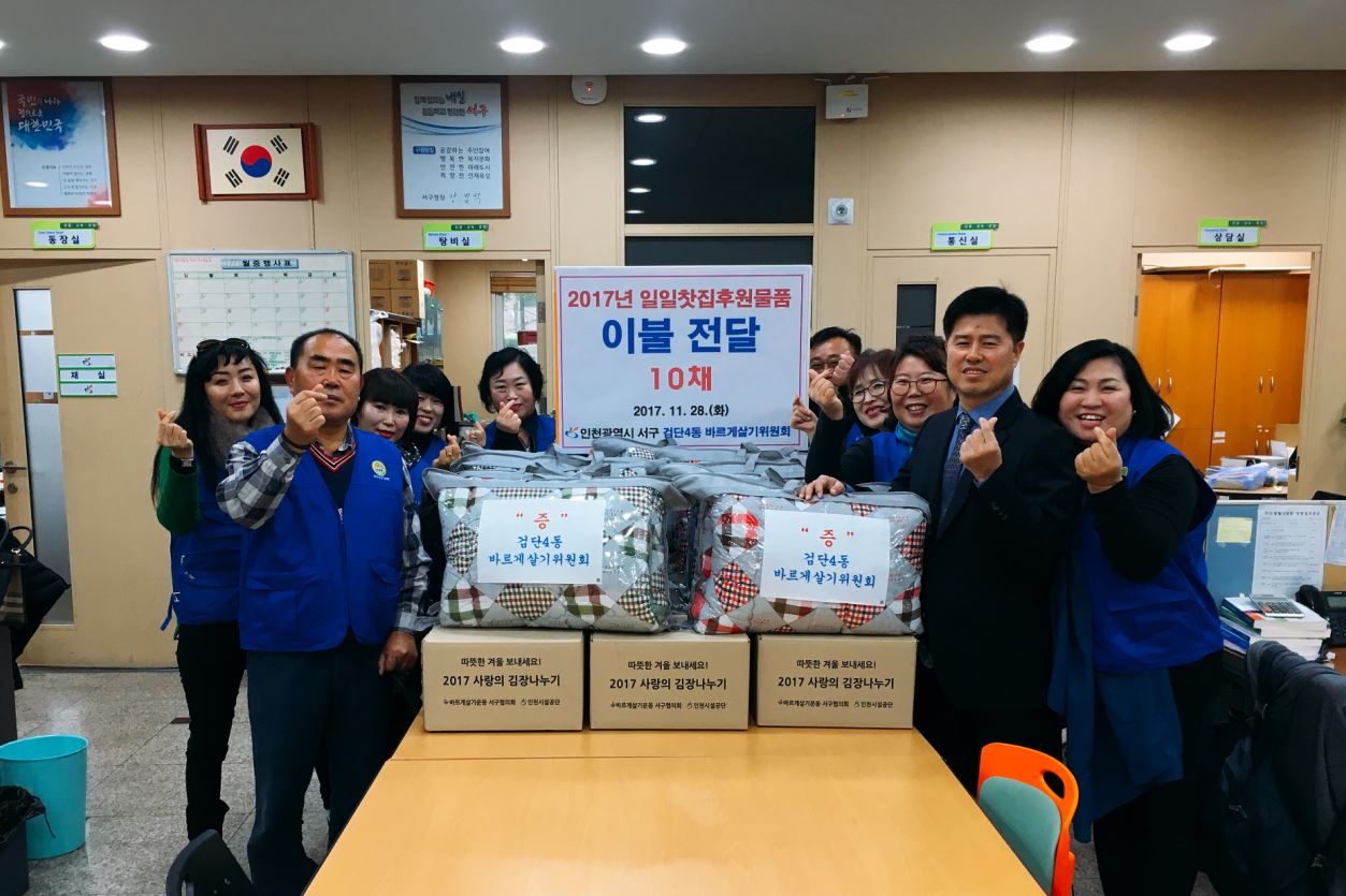 인천시 서구 검단4동 바르게살기위원회(위원장 이만호)는 지난 28일 김장김치와 이불을 어려운 이웃에게 전달했다고 밝혔다.